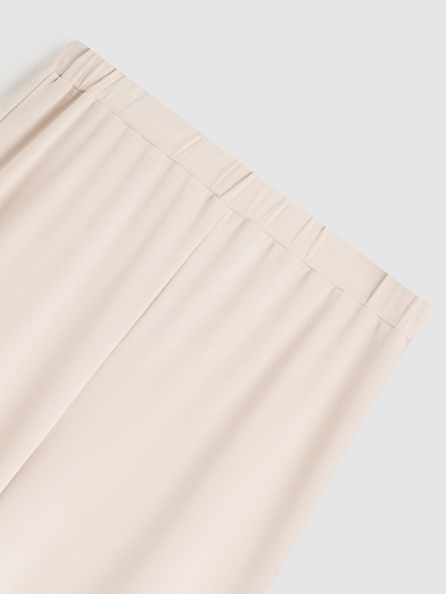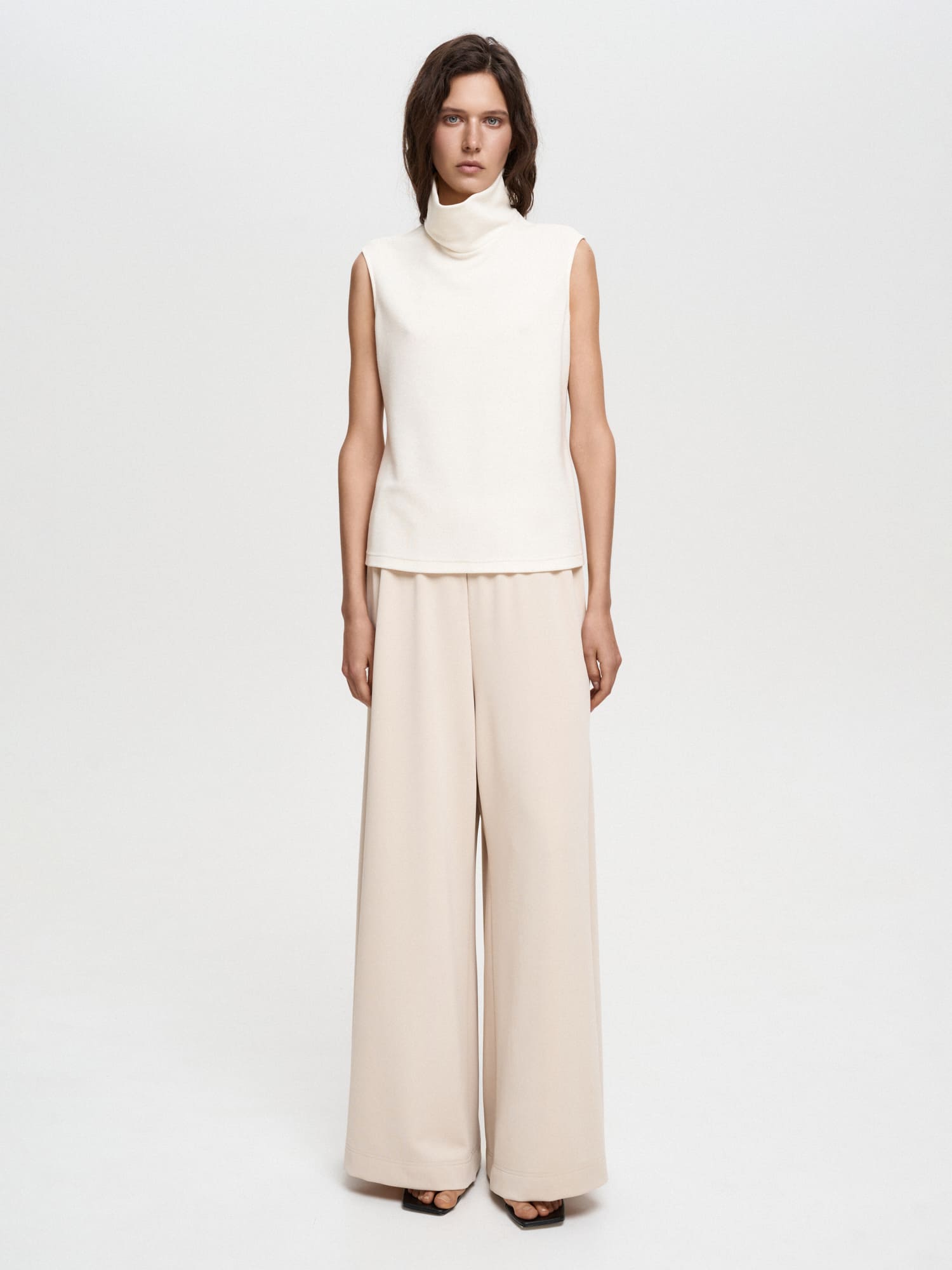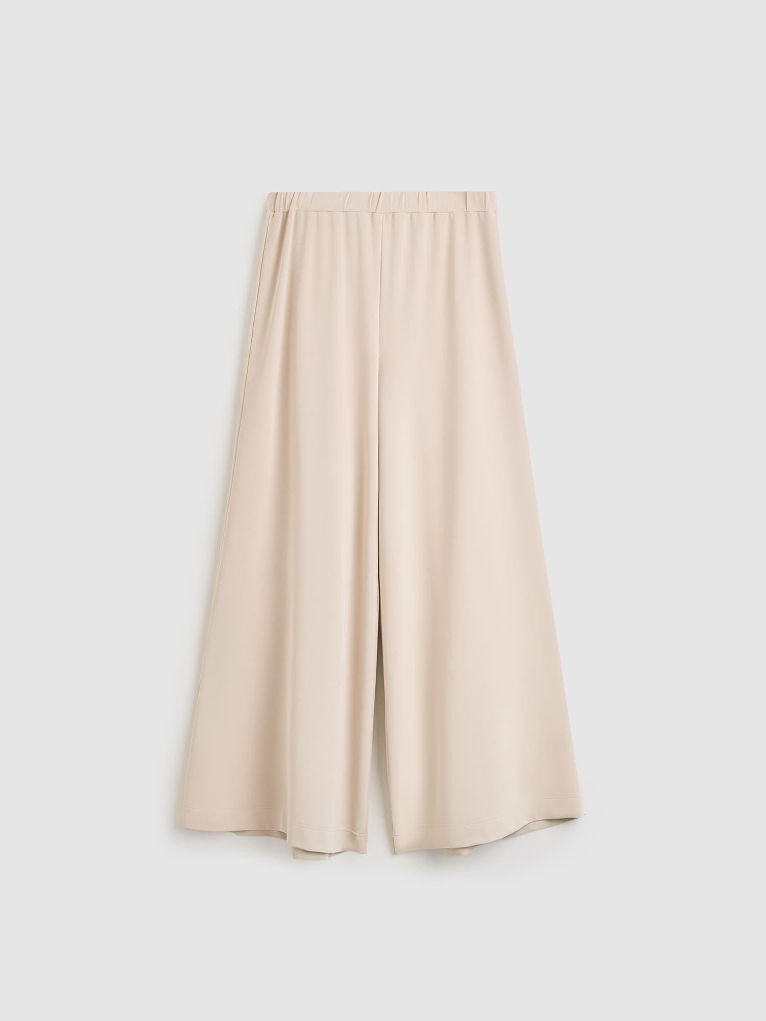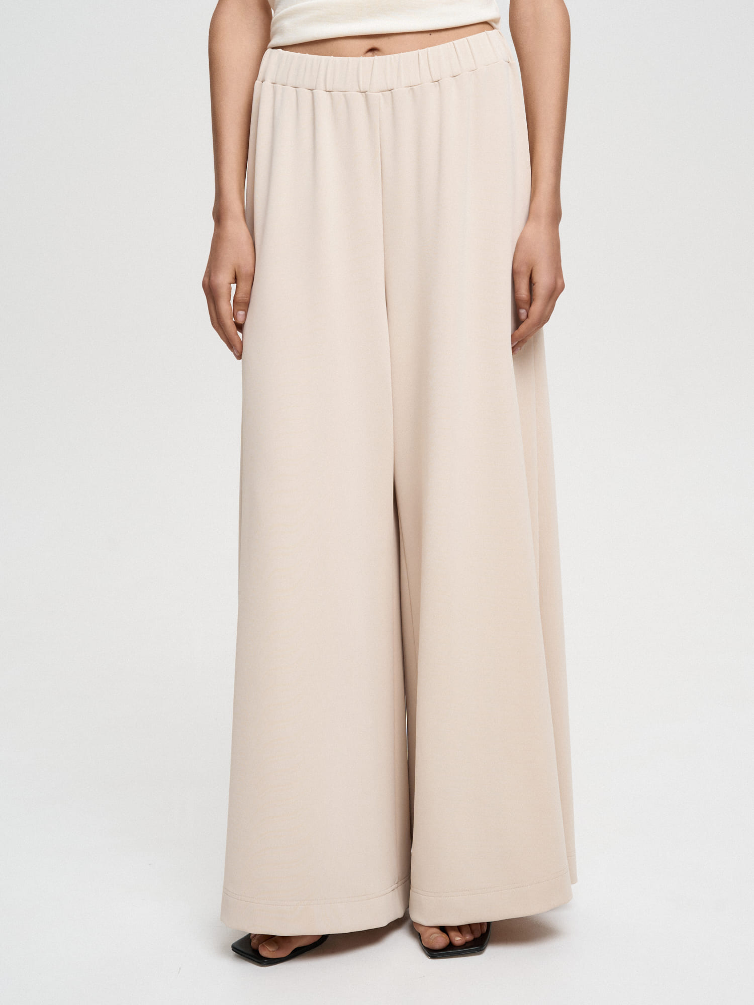 Мягкие брюки с расклешенным силуэтом от бедра создают элегантный и женственный образ. Отсутствие карманов делает их идеальными для многослойных луков — сочетайте с платьями, юбками или объемными свитерами.