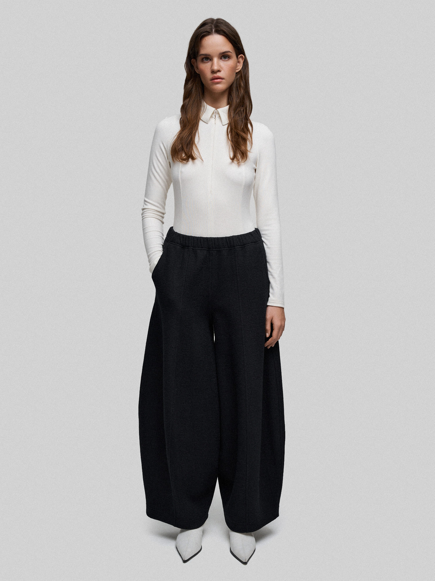 Брюки свободного кроя с выразительным силуэтом. Вертикальные рельефы и продуманная форма создают современный архитектурный образ, сохраняя при этом комфорт и свободу движений.