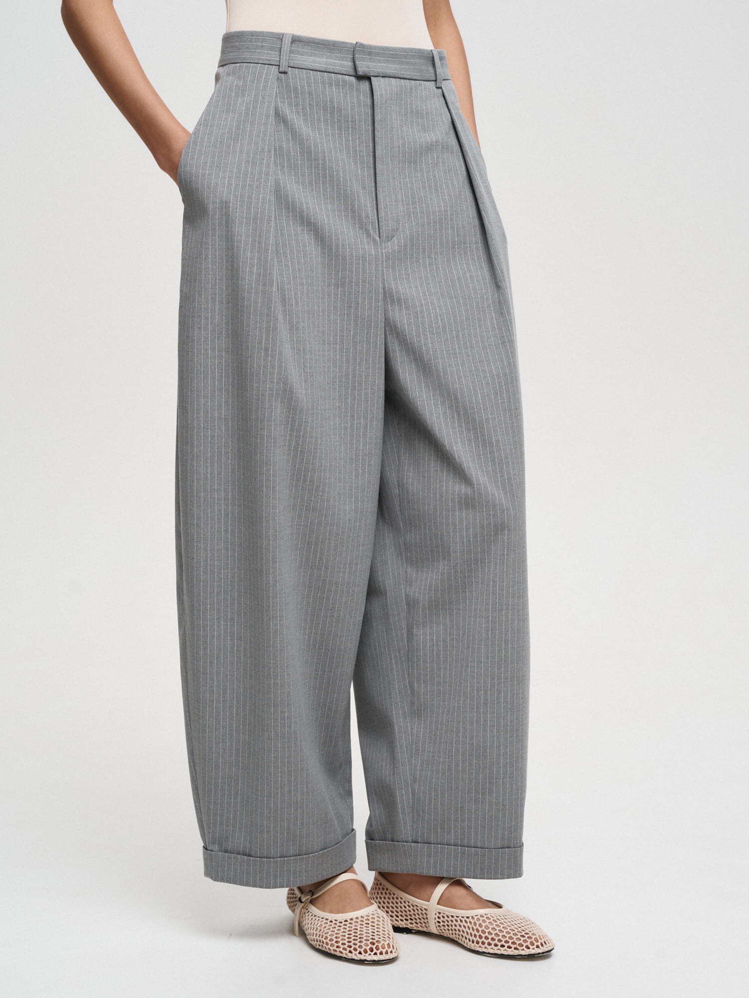 Женские брюки свободного кроя – идеальный баланс делового стиля и повседневного удобства. Вертикальная тонкая полоска визуально вытягивает силуэт, придавая образу особую элегантность. Длина до щиколотки с аккуратными отворотами создает модный акцент, подчеркивая обувь.
