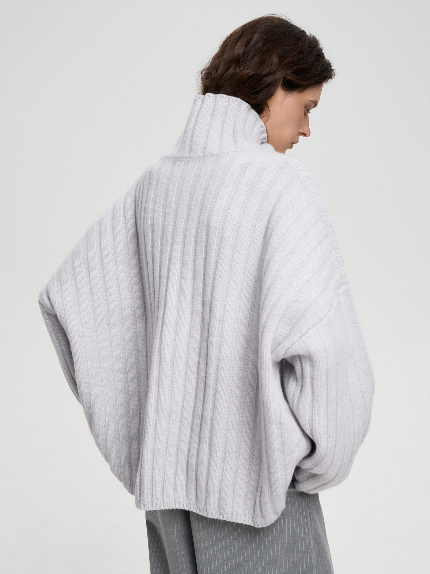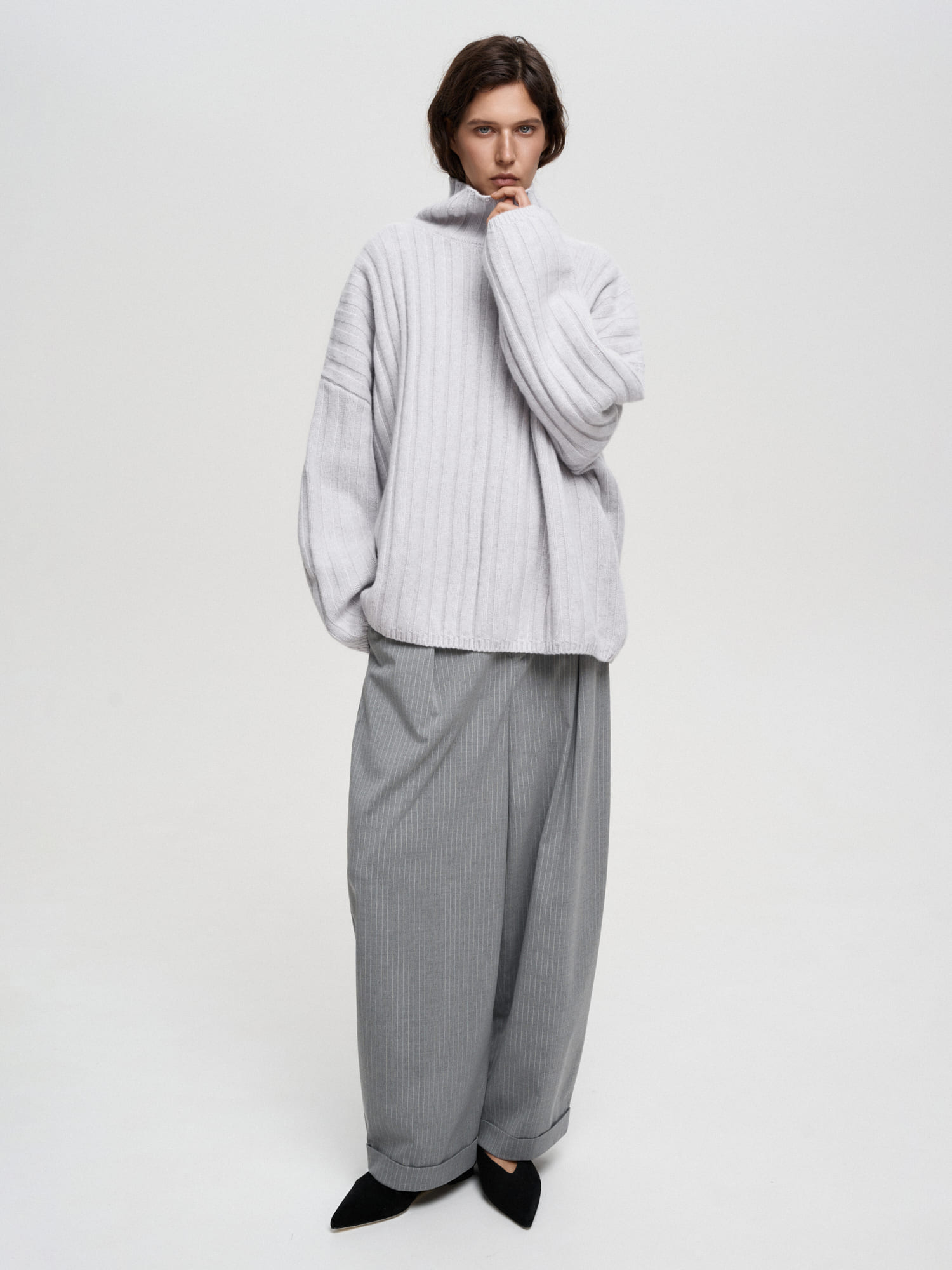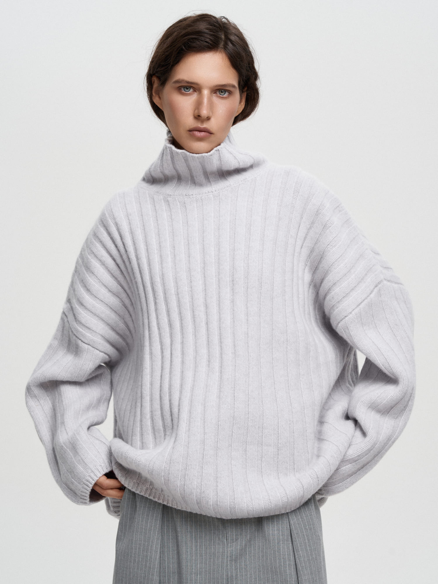 Уютный шерстяной свитер oversize-кроя с фактурной вязкой «резинка» — идеальное сочетание тепла, мягкости и современного силуэта. Высокий воротник-стойка добавляет модели стильную деталь, а свободный крой обеспечивает комфорт в течение всего дня.