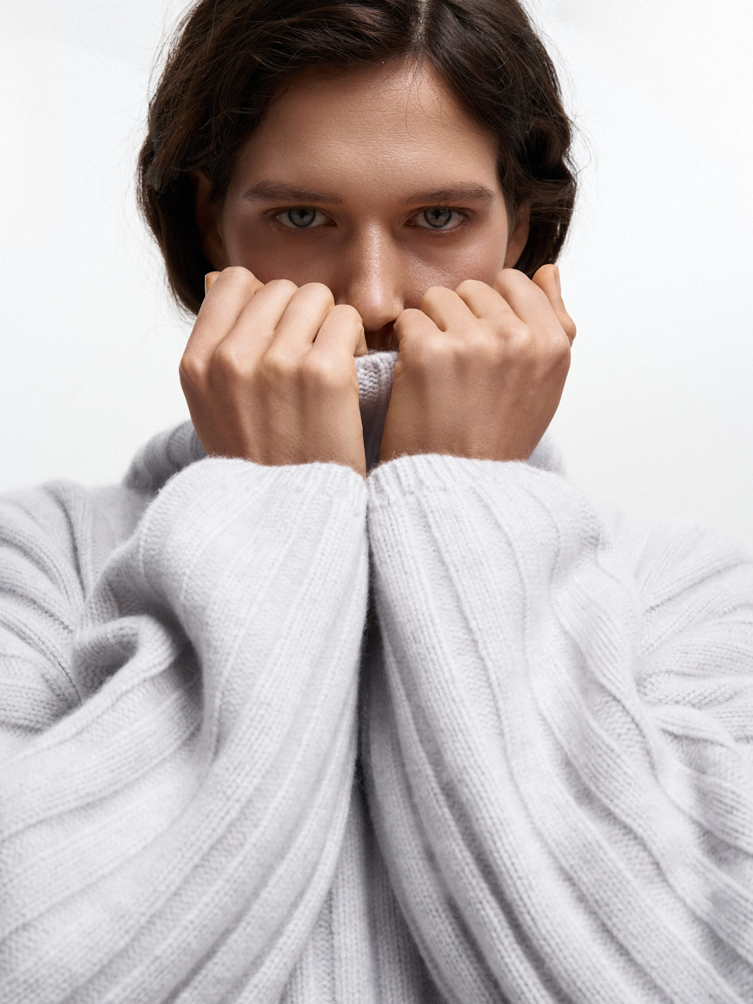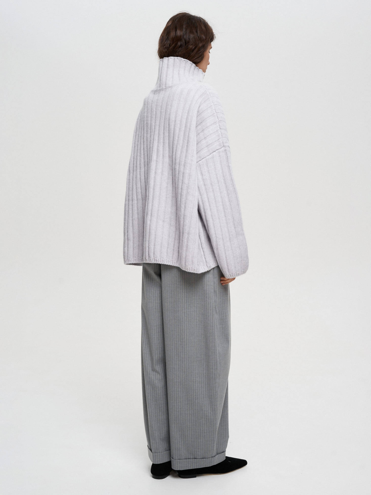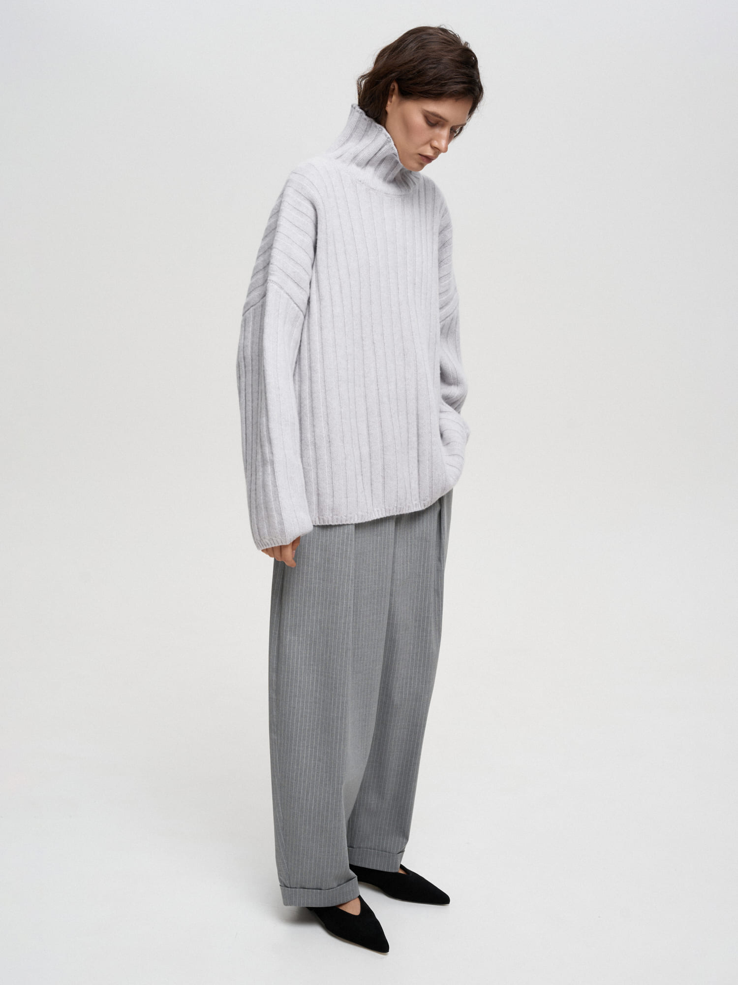 Уютный шерстяной свитер oversize-кроя с фактурной вязкой «резинка» — идеальное сочетание тепла, мягкости и современного силуэта. Высокий воротник-стойка добавляет модели стильную деталь, а свободный крой обеспечивает комфорт в течение всего дня.