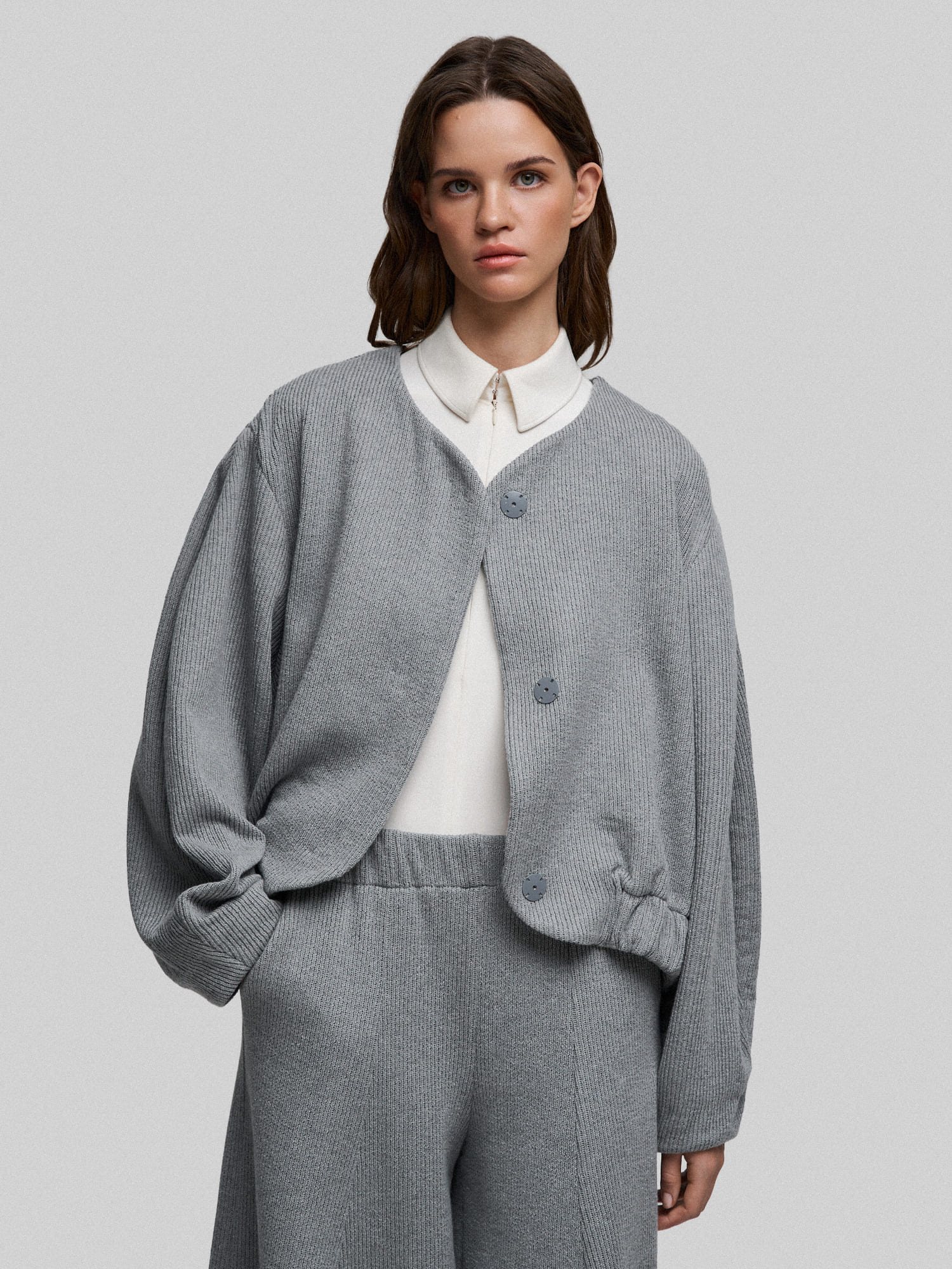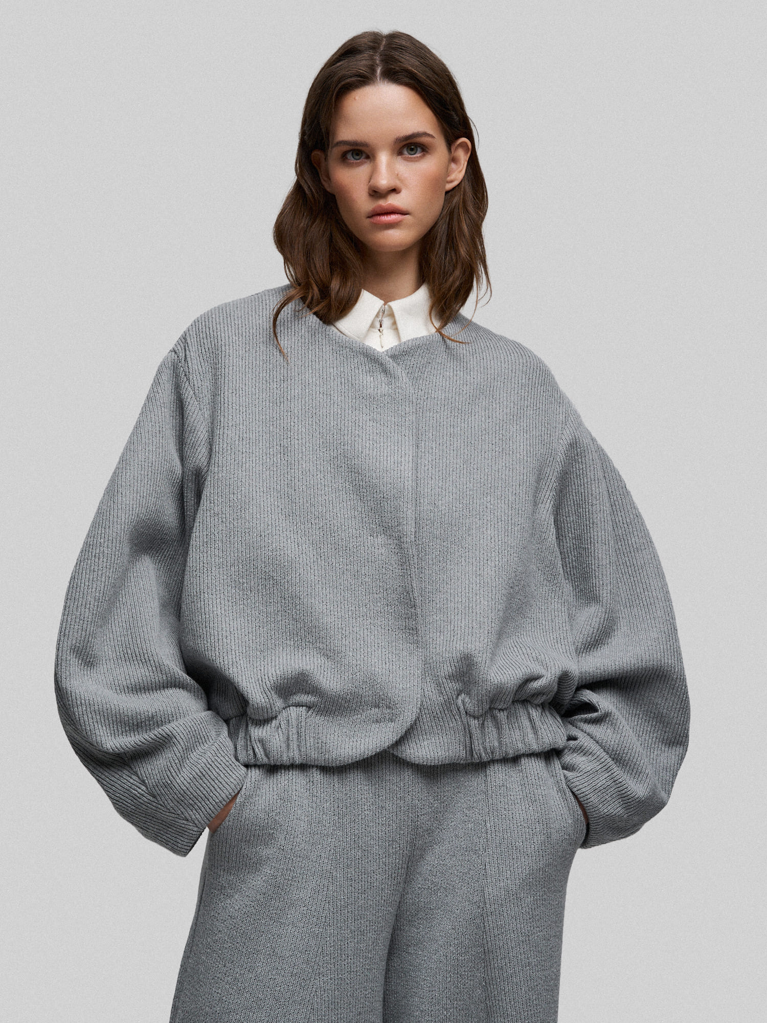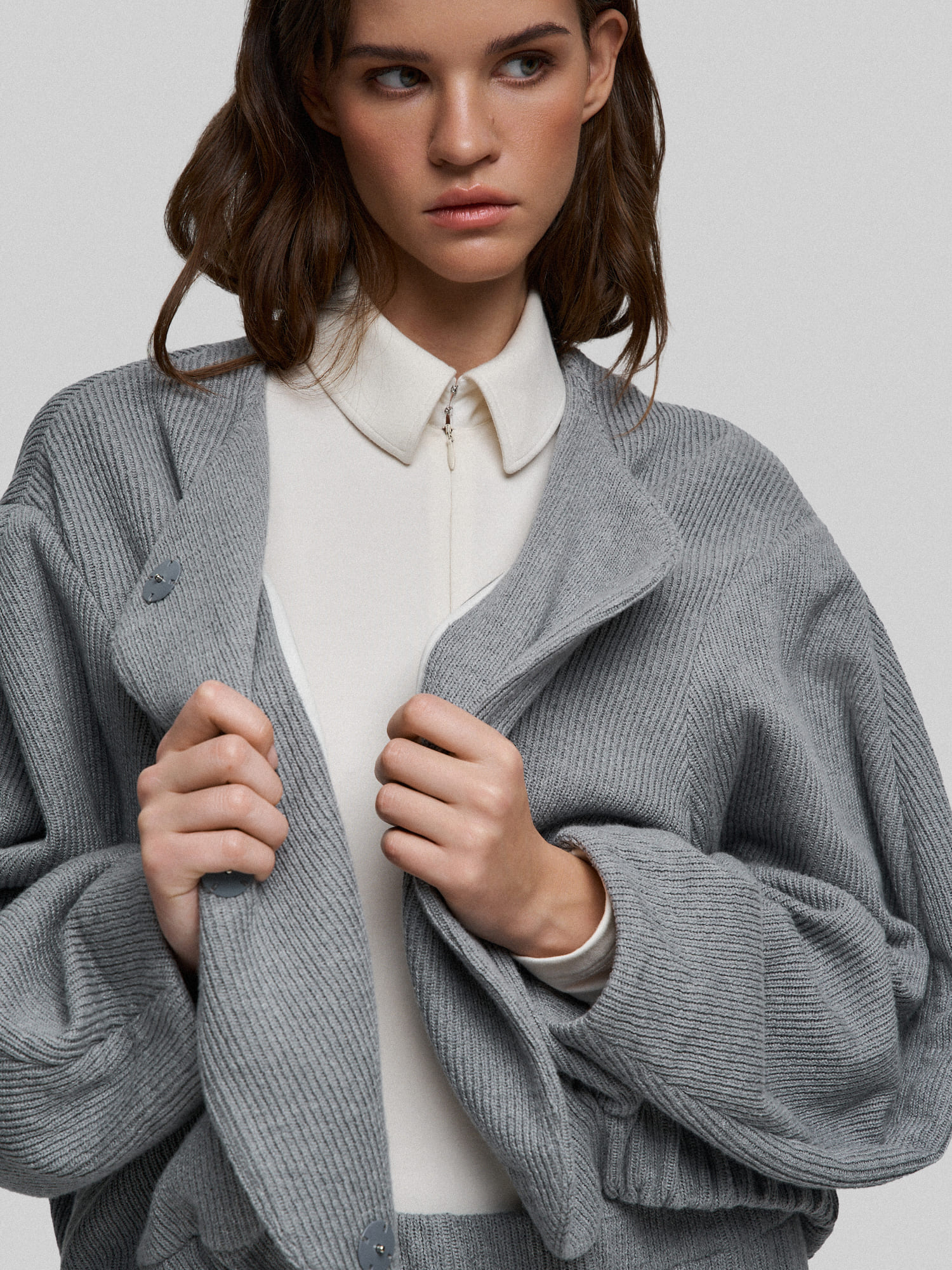 Мягкий трикотажный бомбер серого оттенка - идеальный выбор для создания стильных луков в духе relaxed fashion. Укороченная длина и застежка на кнопках обеспечивают максимальный комфорт, а объемные рукава и широкая резинка по низу создают модный силуэт.