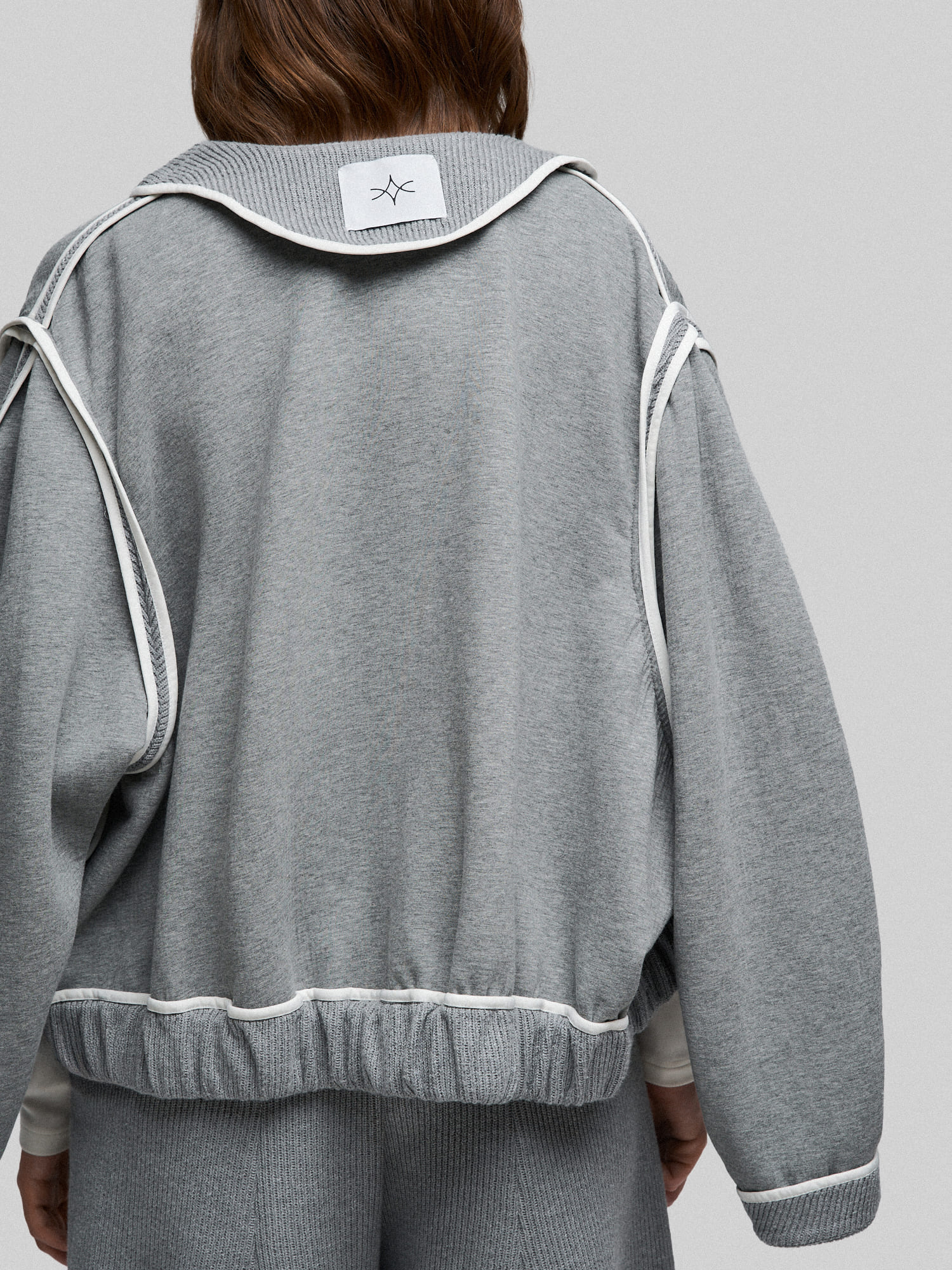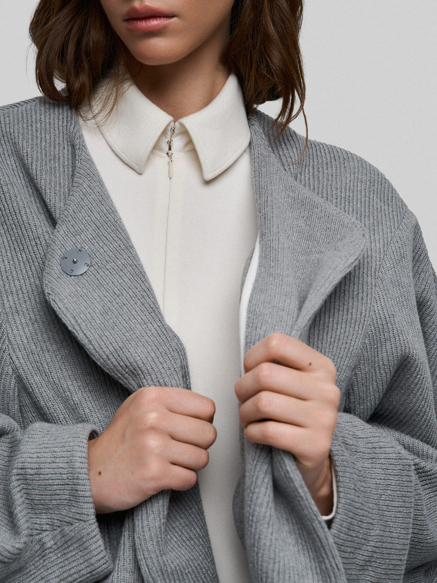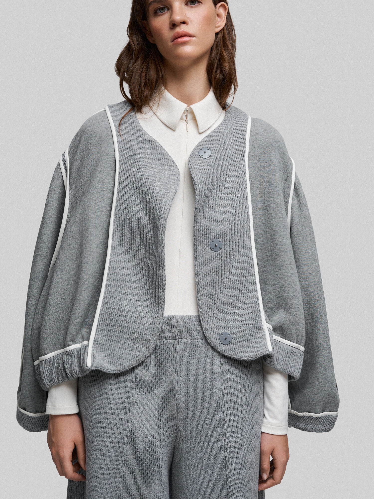 Мягкий трикотажный бомбер серого оттенка - идеальный выбор для создания стильных луков в духе relaxed fashion. Укороченная длина и застежка на кнопках обеспечивают максимальный комфорт, а объемные рукава и широкая резинка по низу создают модный силуэт.