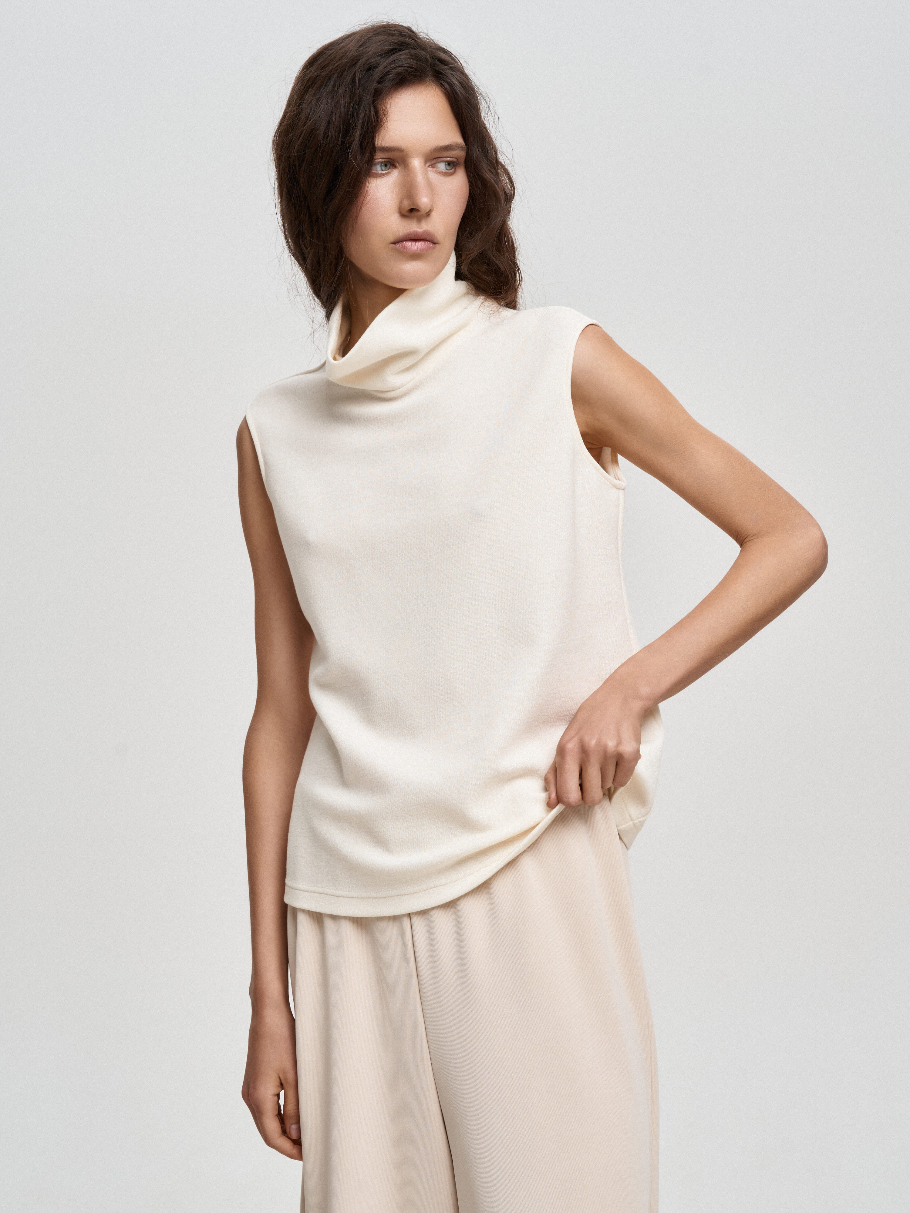 Трикотажный джемпер без рукавов с воротником-стойкой — базовая вещь для элегантных и повседневных луков. Полуприлегающий крой и длина чуть ниже талии делают его универсальным.