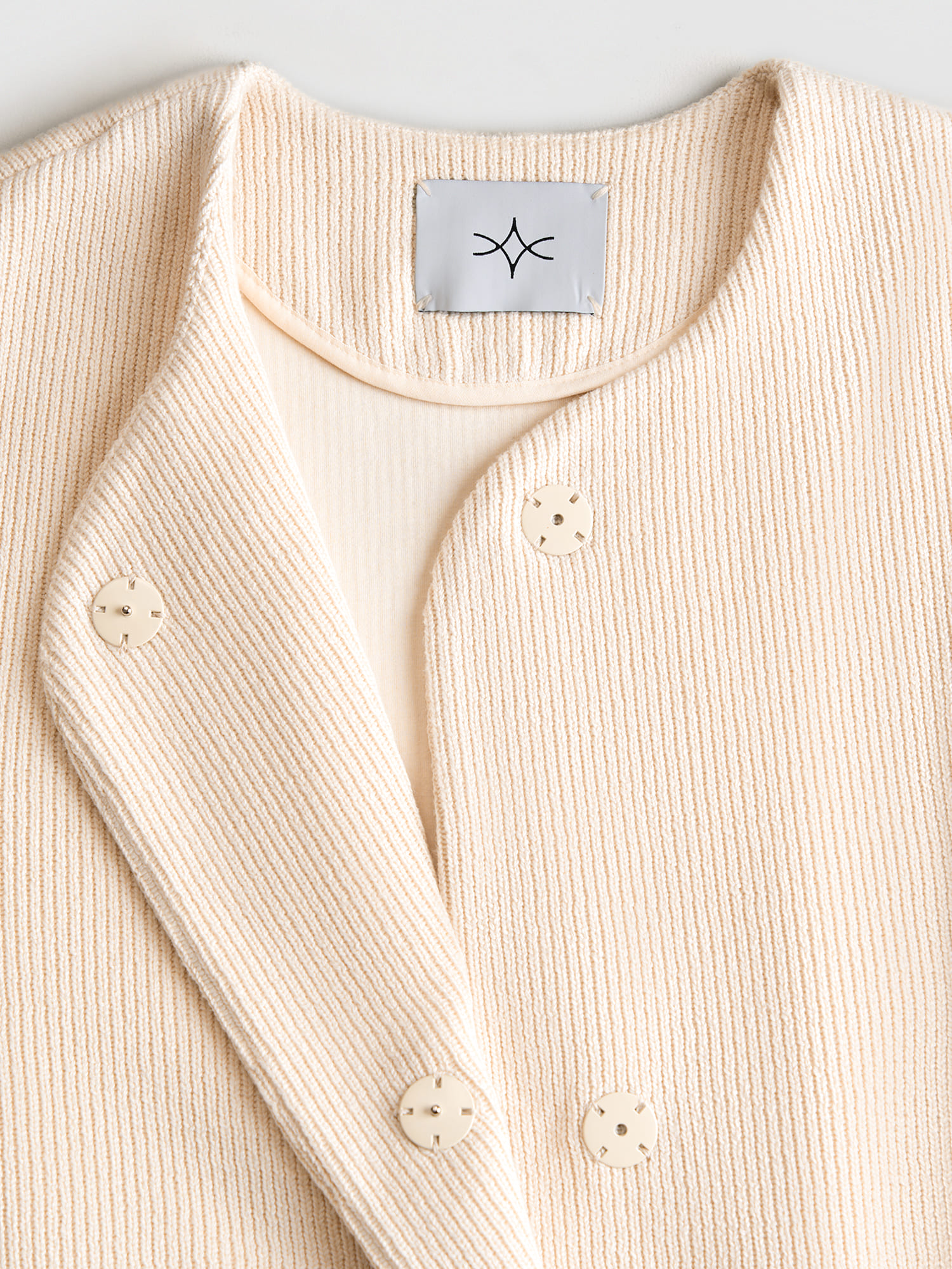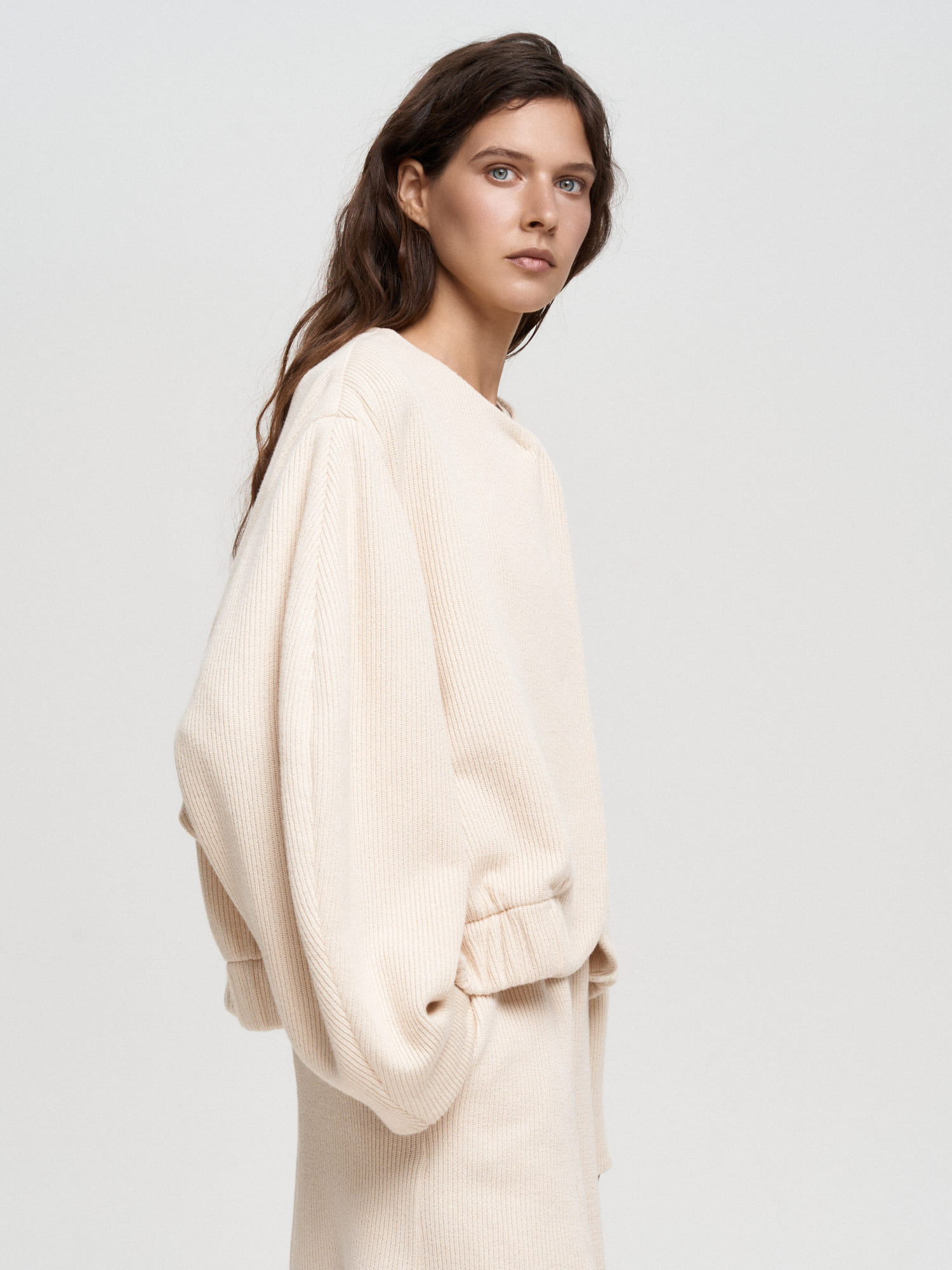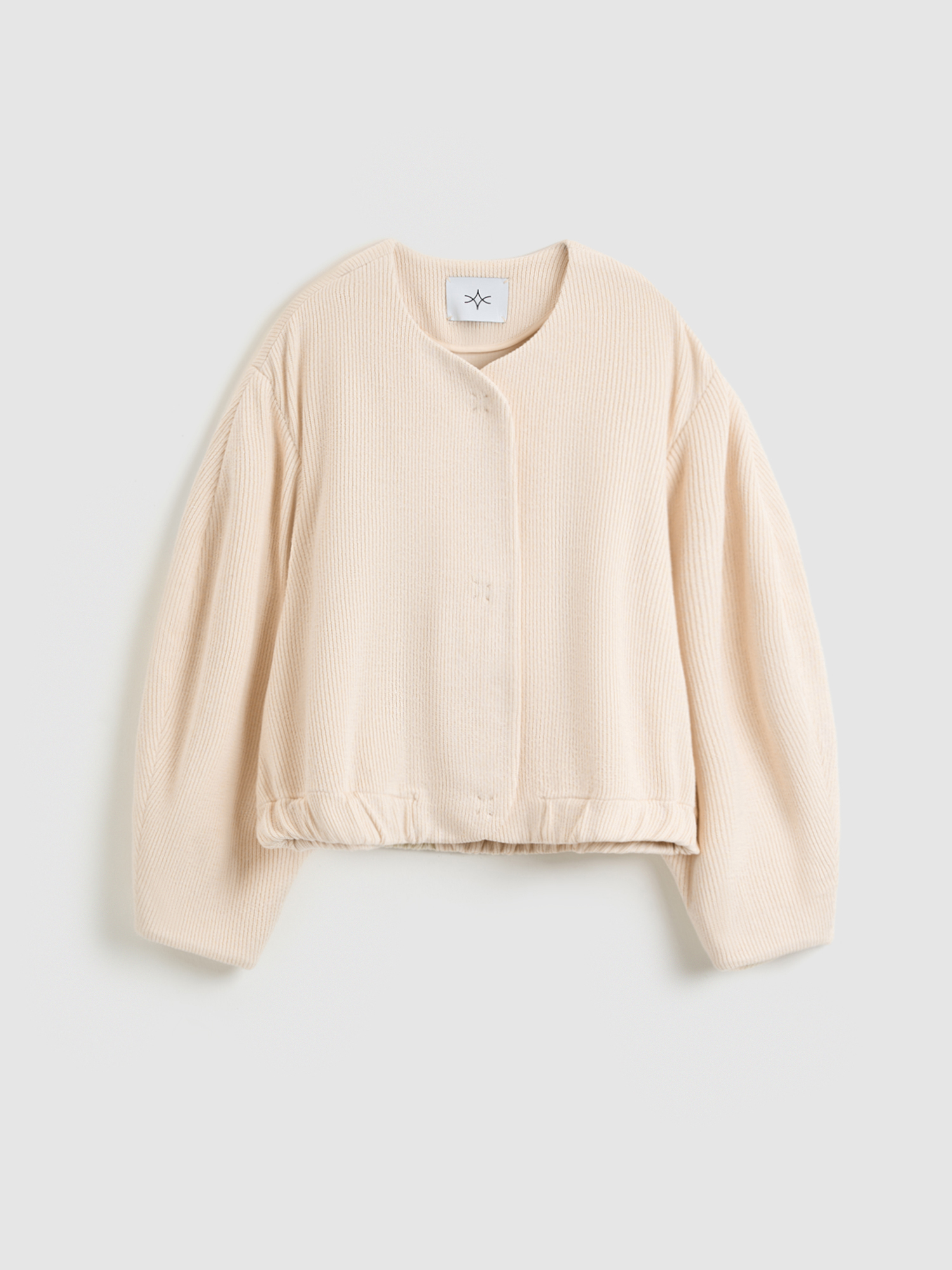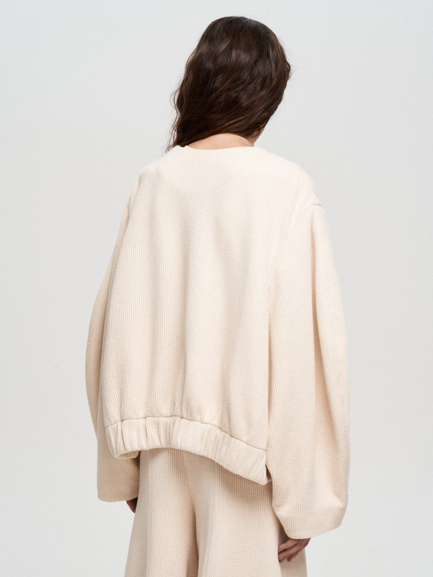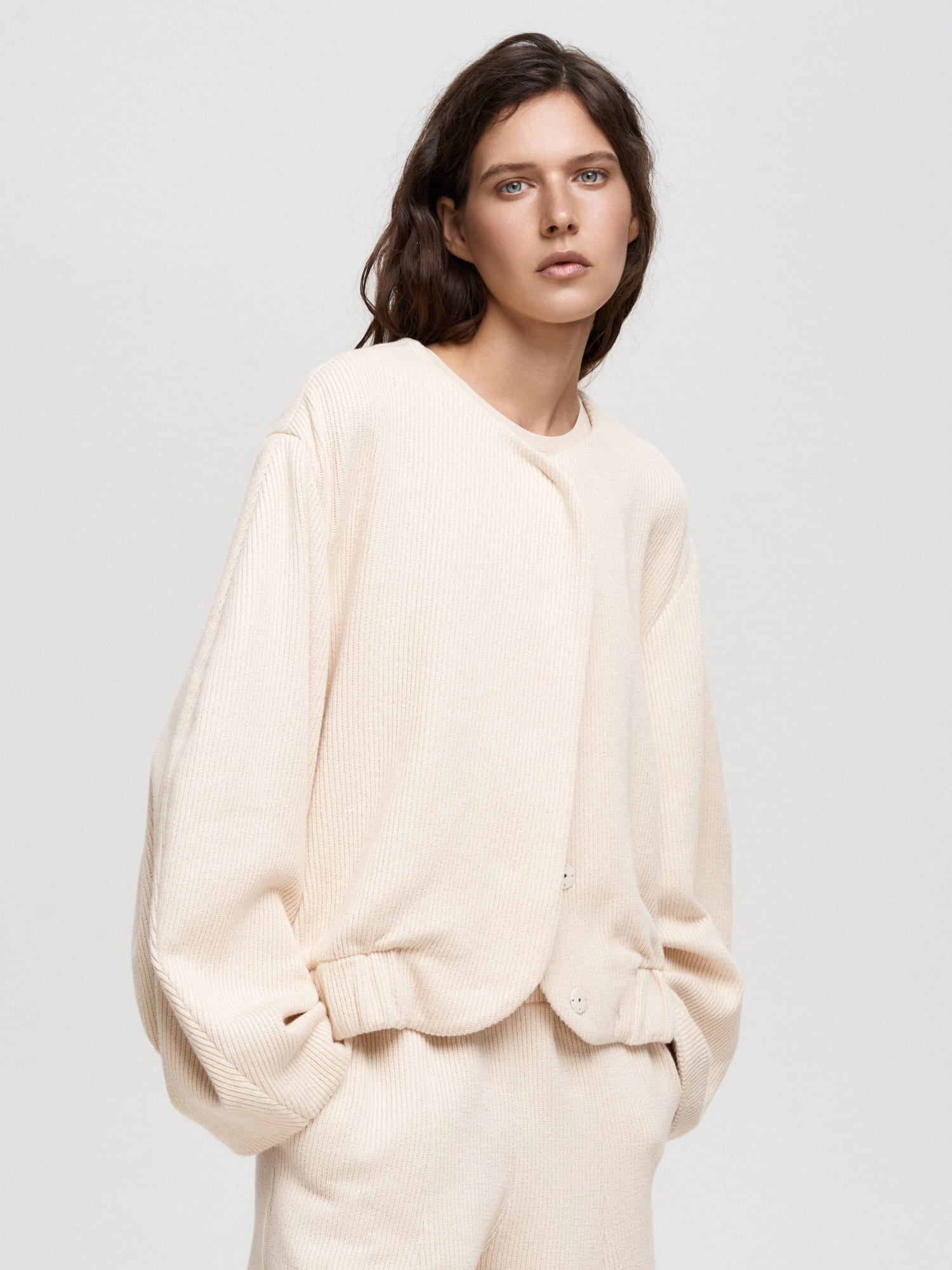 Мягкий трикотажный бомбер молочного оттенка - идеальная одежда для создания стильных луков в духе relaxed fashion. Укороченная длина и застежка на кнопках обеспечивают максимальный комфорт, а объемные рукава и широкая резинка по низу создают модный силуэт.
