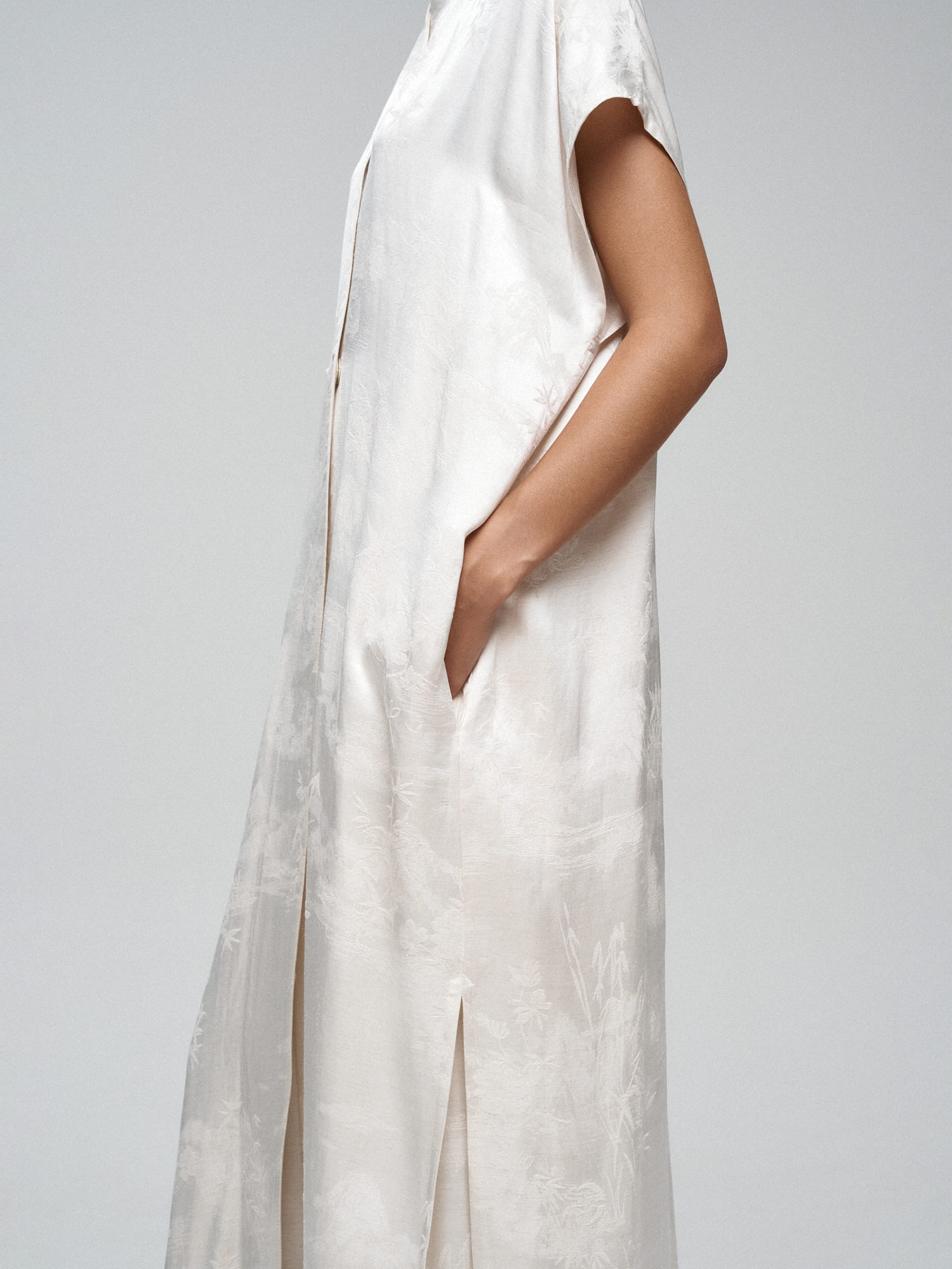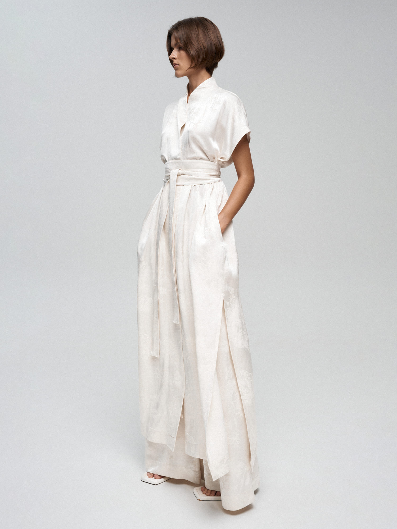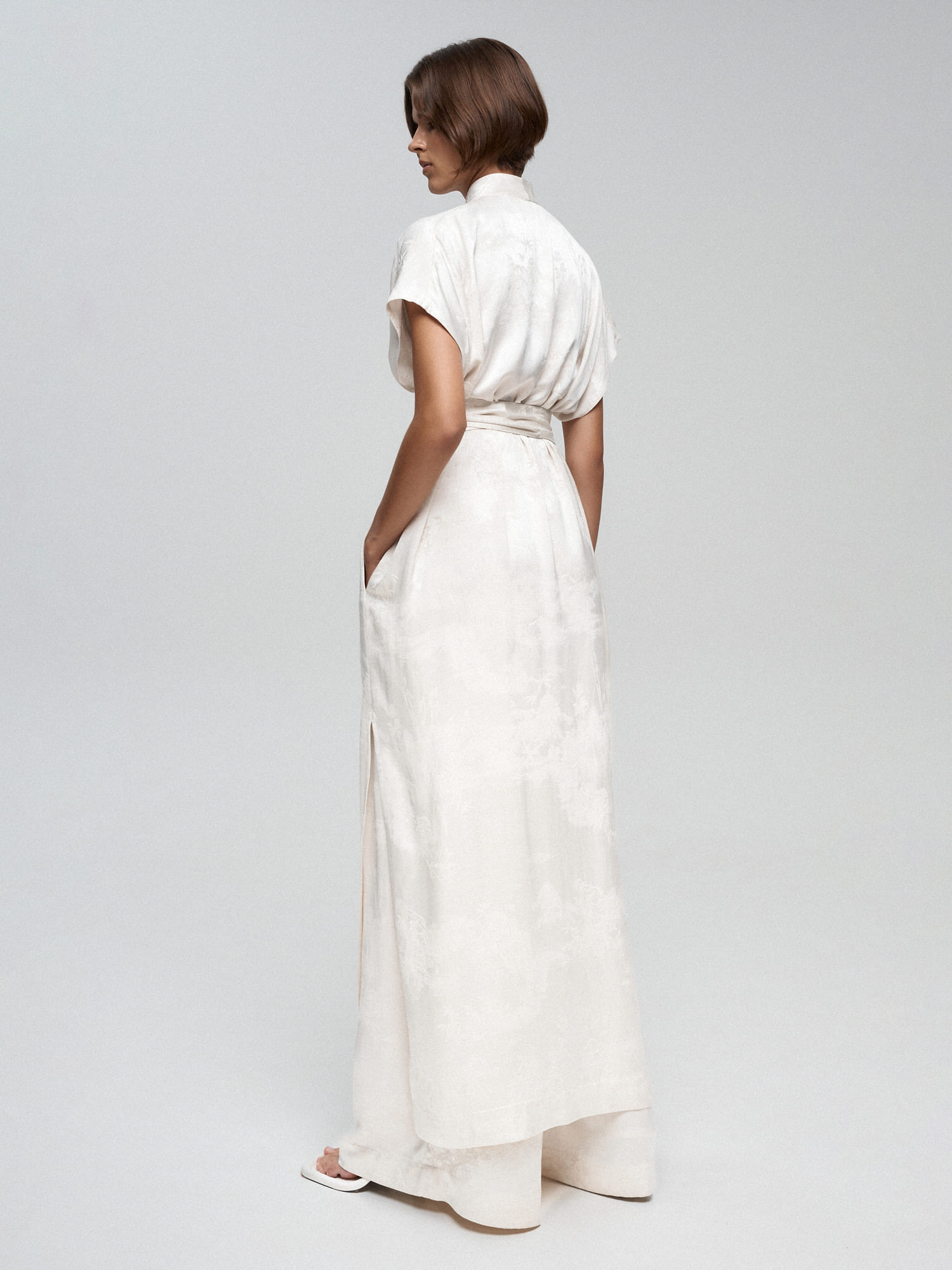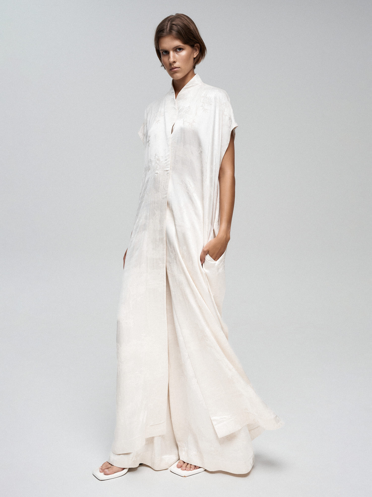 Длинное платье без рукавов со спущенной линией плеча – идеальный вариант для жарких дней. Oversize крой с элементами кимоно создает ощущение легкости и непринужденной элегантности.