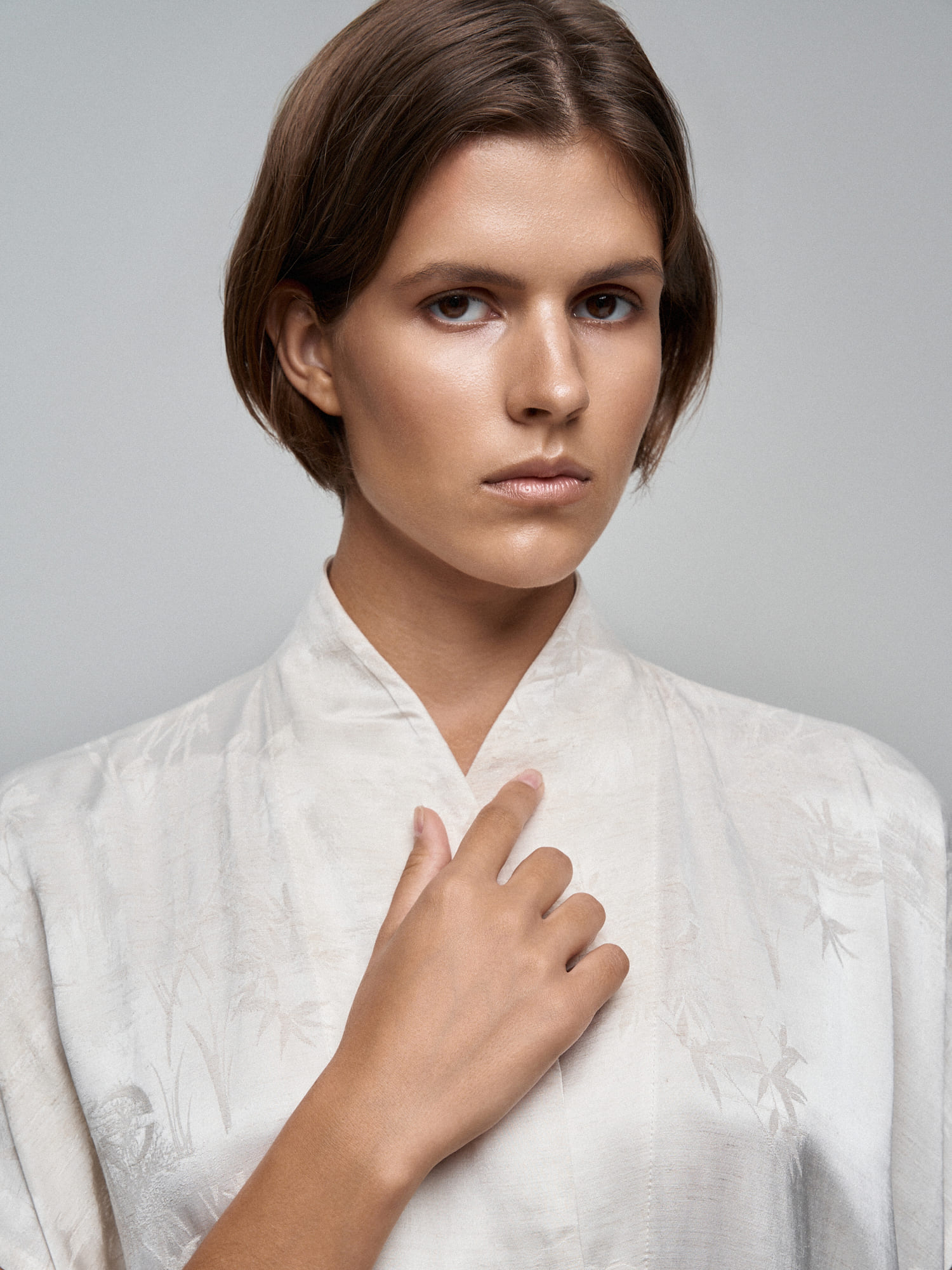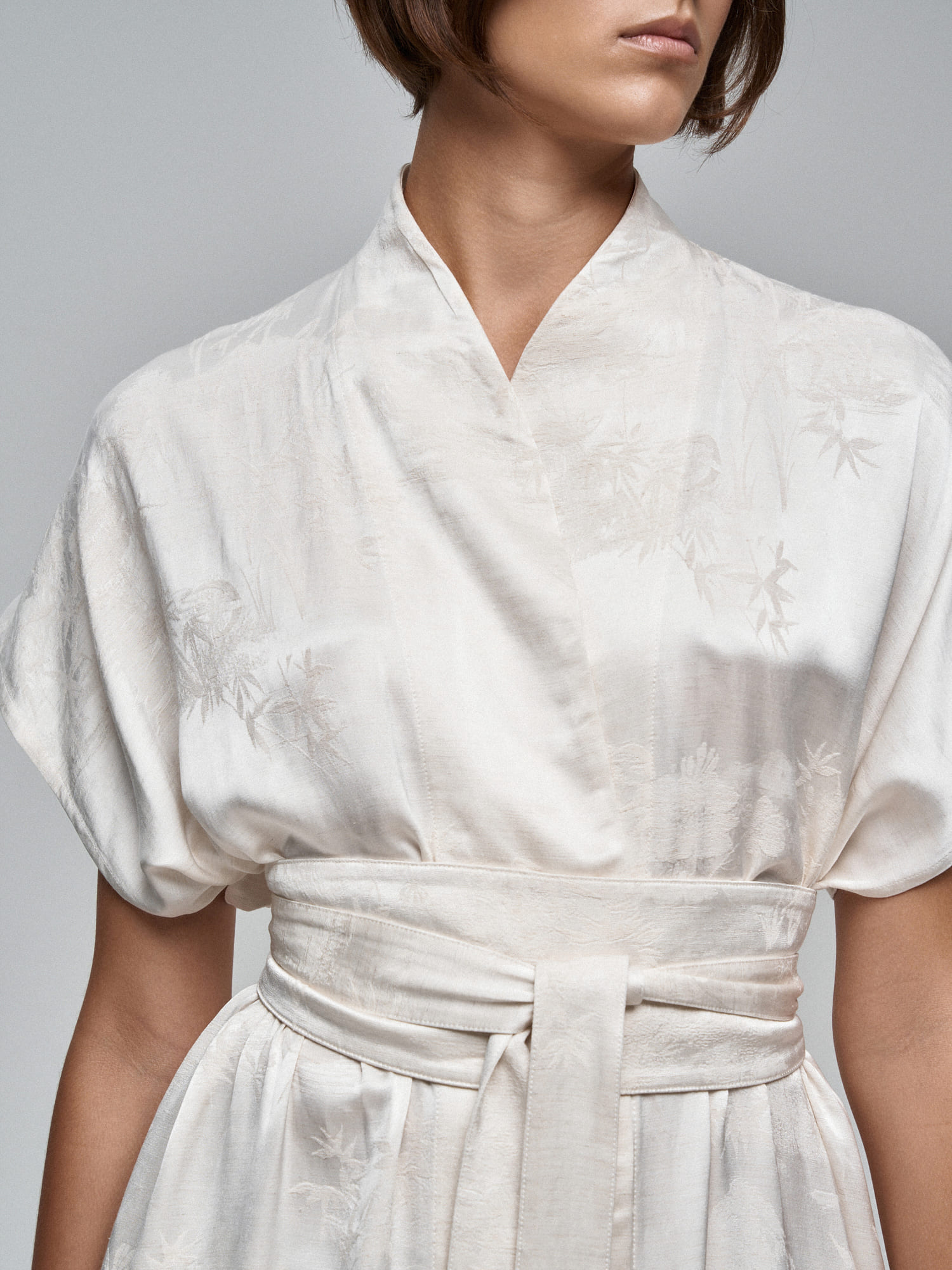 Платье требует бережного ухода: рекомендована профессиональная химическая чистка. Сушите изделие в расправленном виде вдали от источников тепла и солнечных лучей. Гладьте с изнаночной стороны при температуре не выше 110°C.