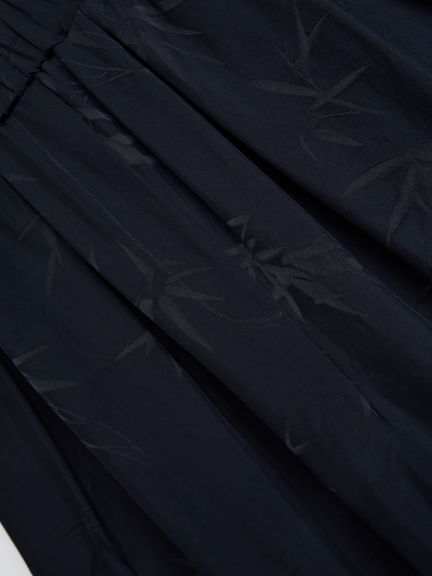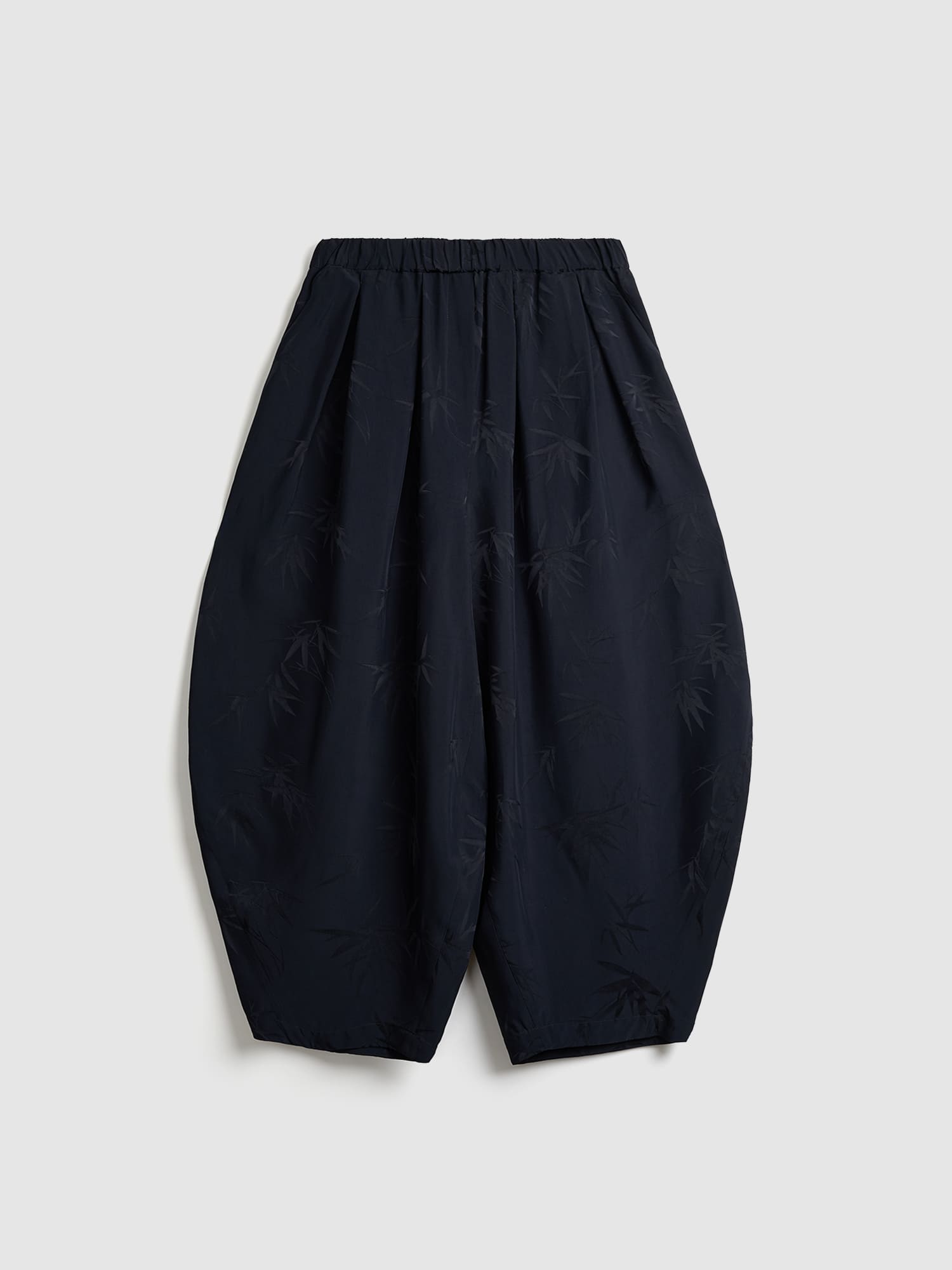 Эффектные брюки О-силуэта из струящейся ткани черного цвета с принтом «Бамбук». Легкая ткань и архитектурный крой делают брюки одновременно выразительными и комфортными.