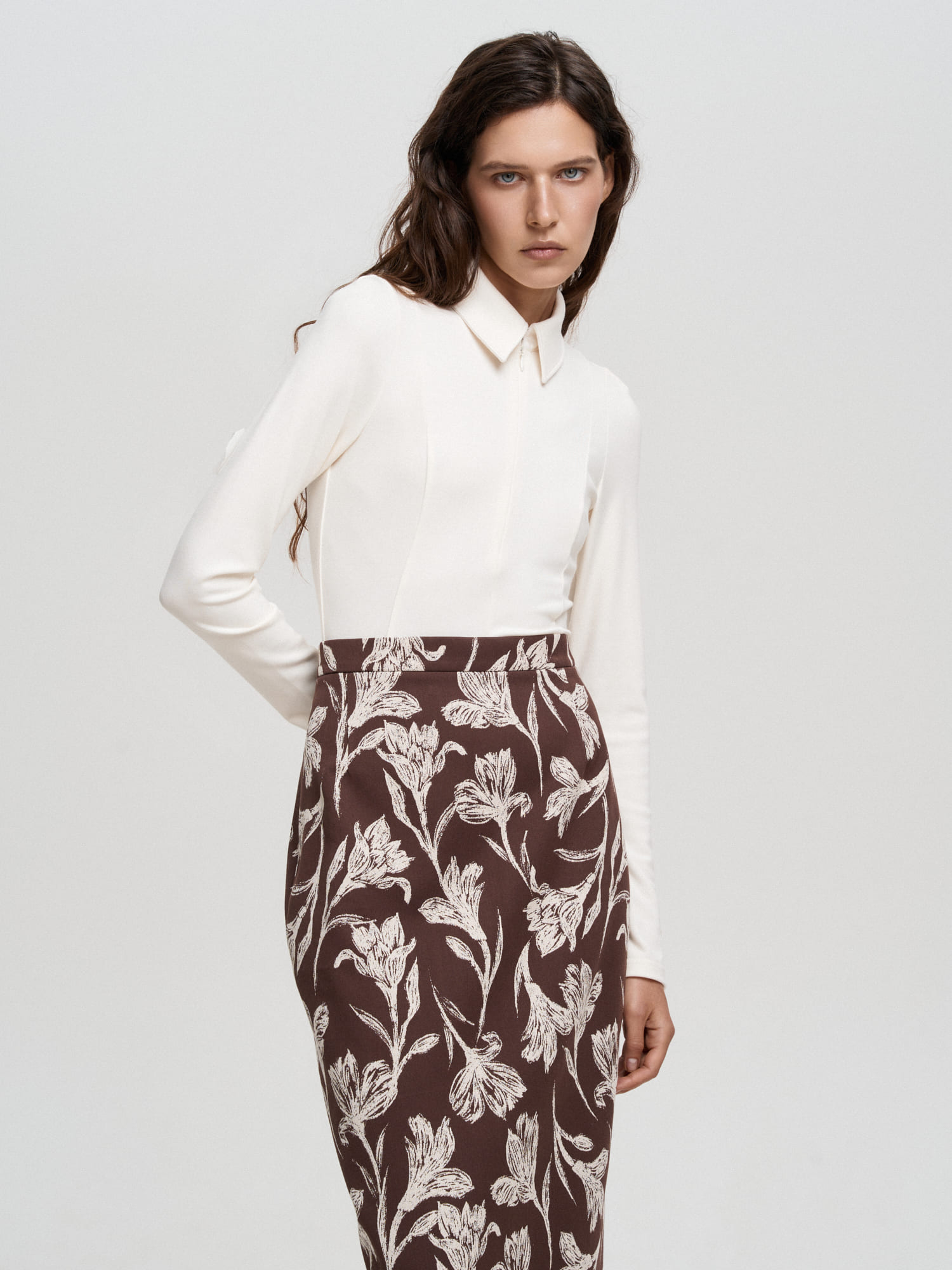 Прямая юбка до щиколотки из натурального хлопка в коричневом цвете с красивым цветочным узором — идеальная основа как для деловых, так и повседневных луков. Чистый силуэт подчеркивает женственность и утонченность форм.