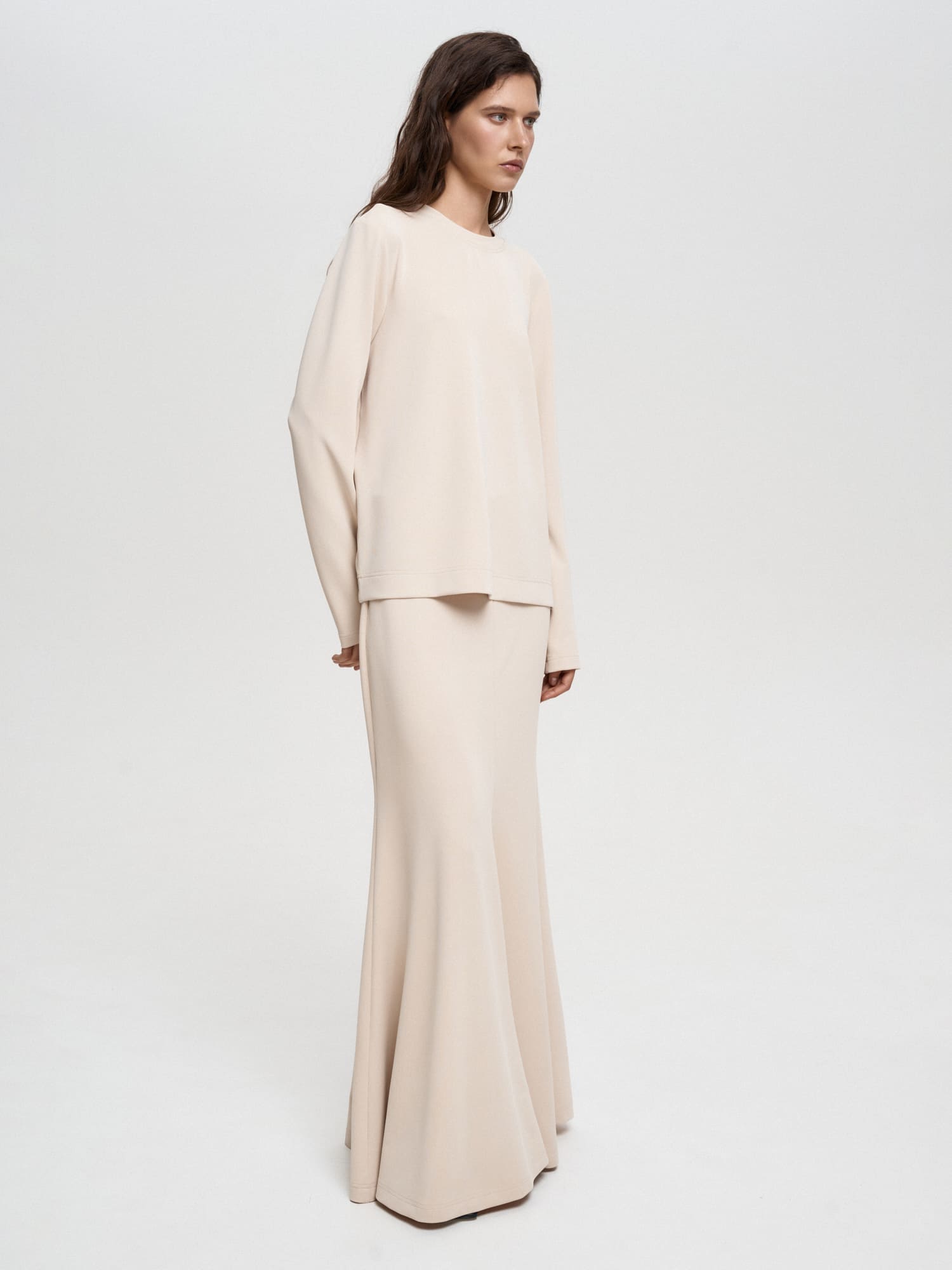 Бежевая юбка-годе из нежного трикотажа с элегантным силуэтом. Приятная к телу ткань красиво струится при ходьбе, создавая изящные драпировки и подчеркивая плавность линий фигуры.