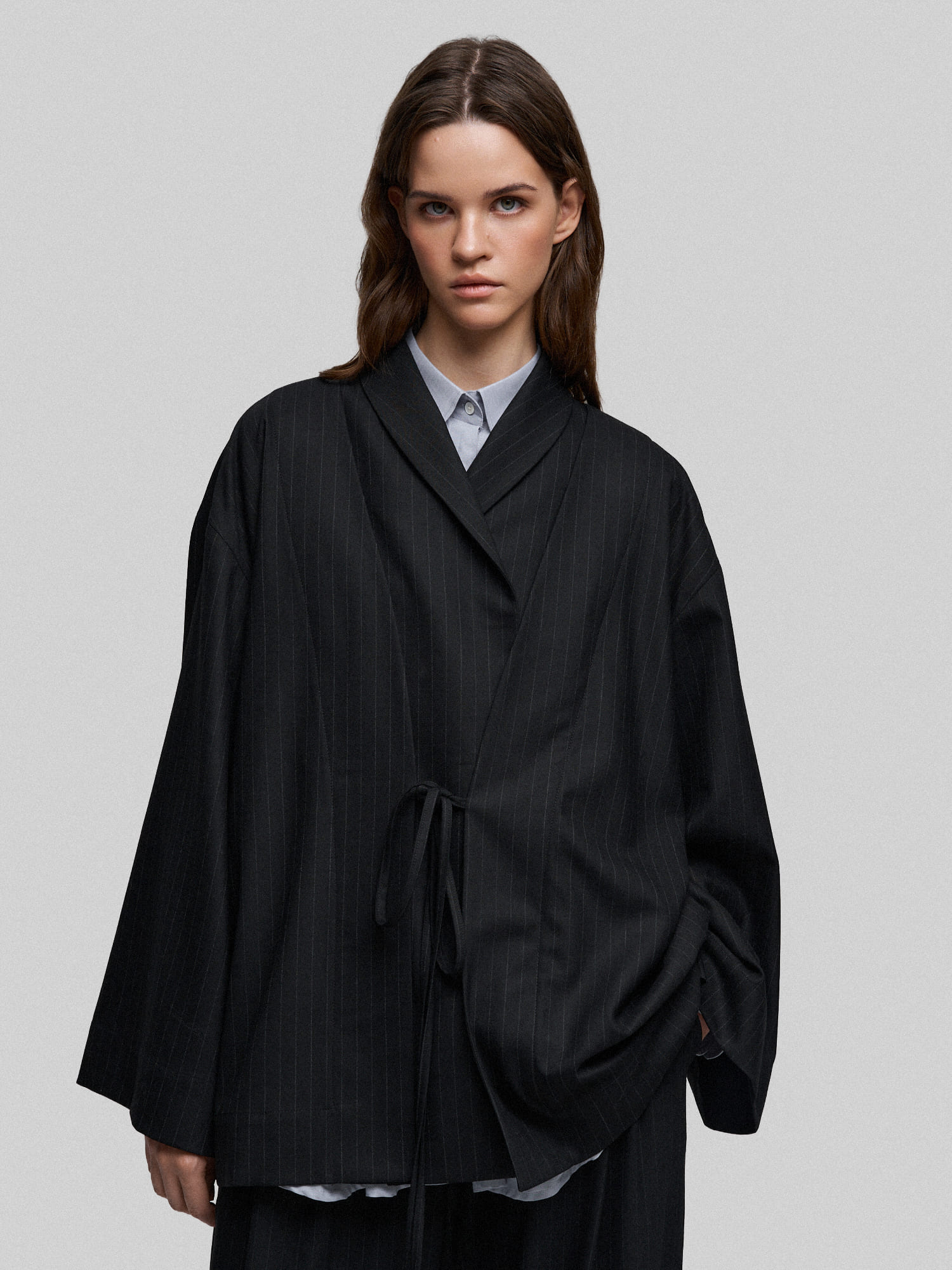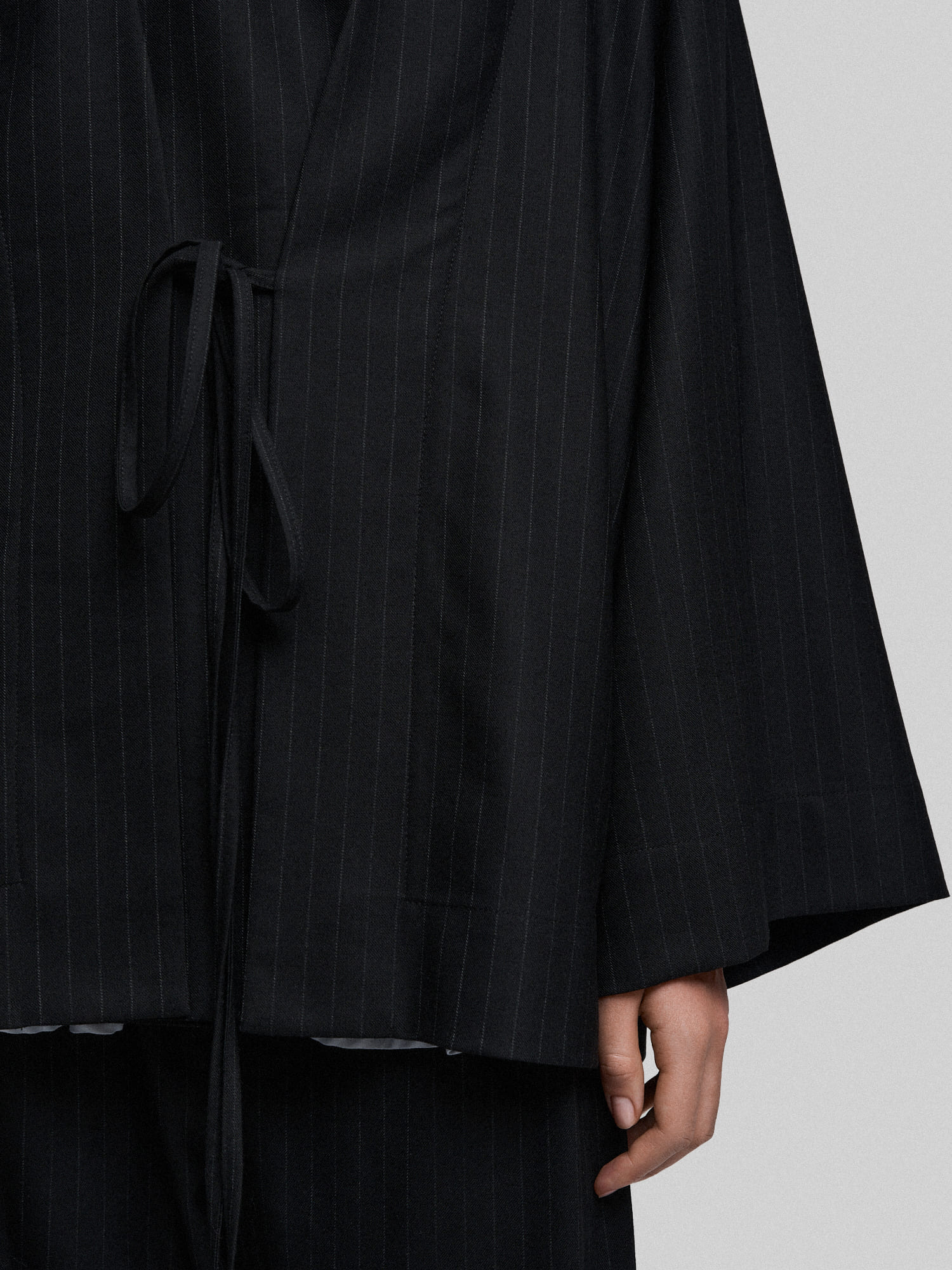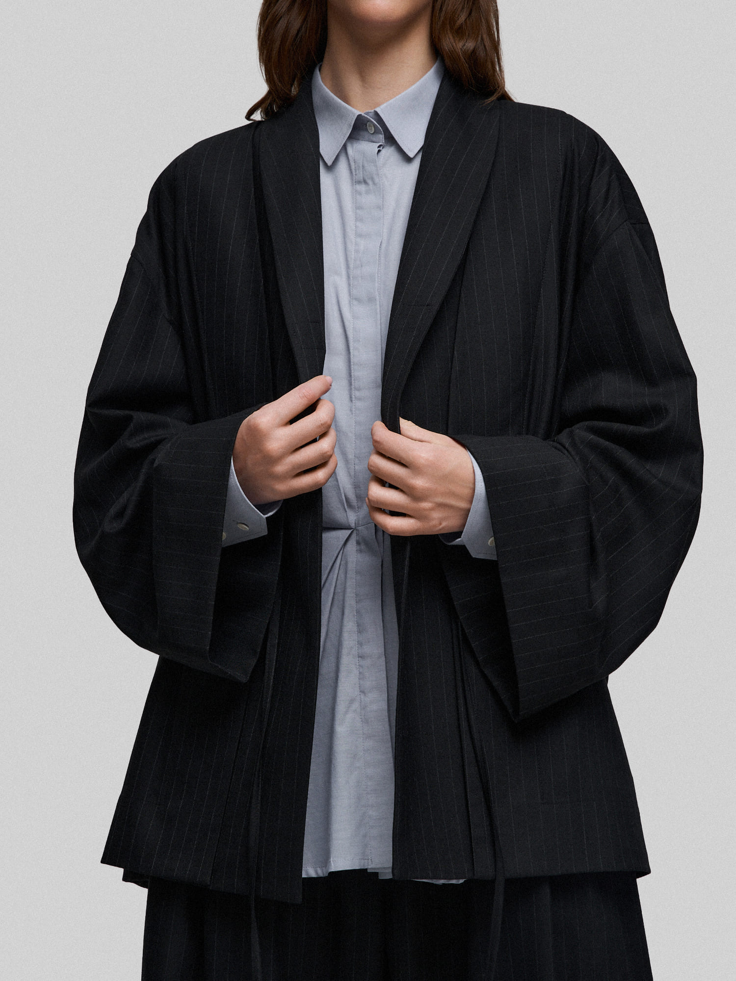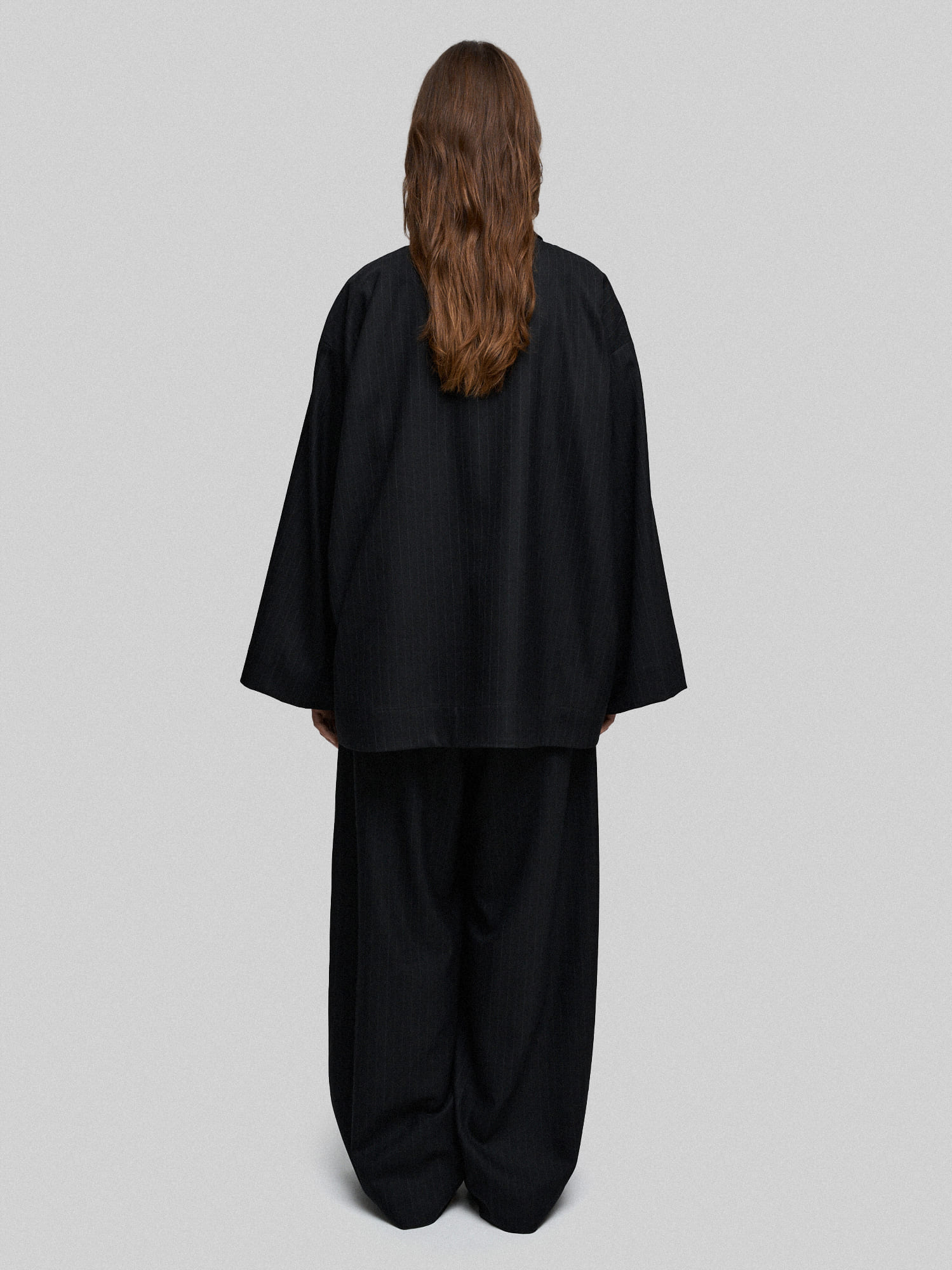 Жакет оверсайз из черной костюмной ткани в тонкую полоску. На полочке за счёт конструктивных элементов создается иллюзия многослойности. Благодаря свободному крою жакет не стесняет движений и отлично сочетается с разными вещами - от облегающих водолазок до объемных свитеров.