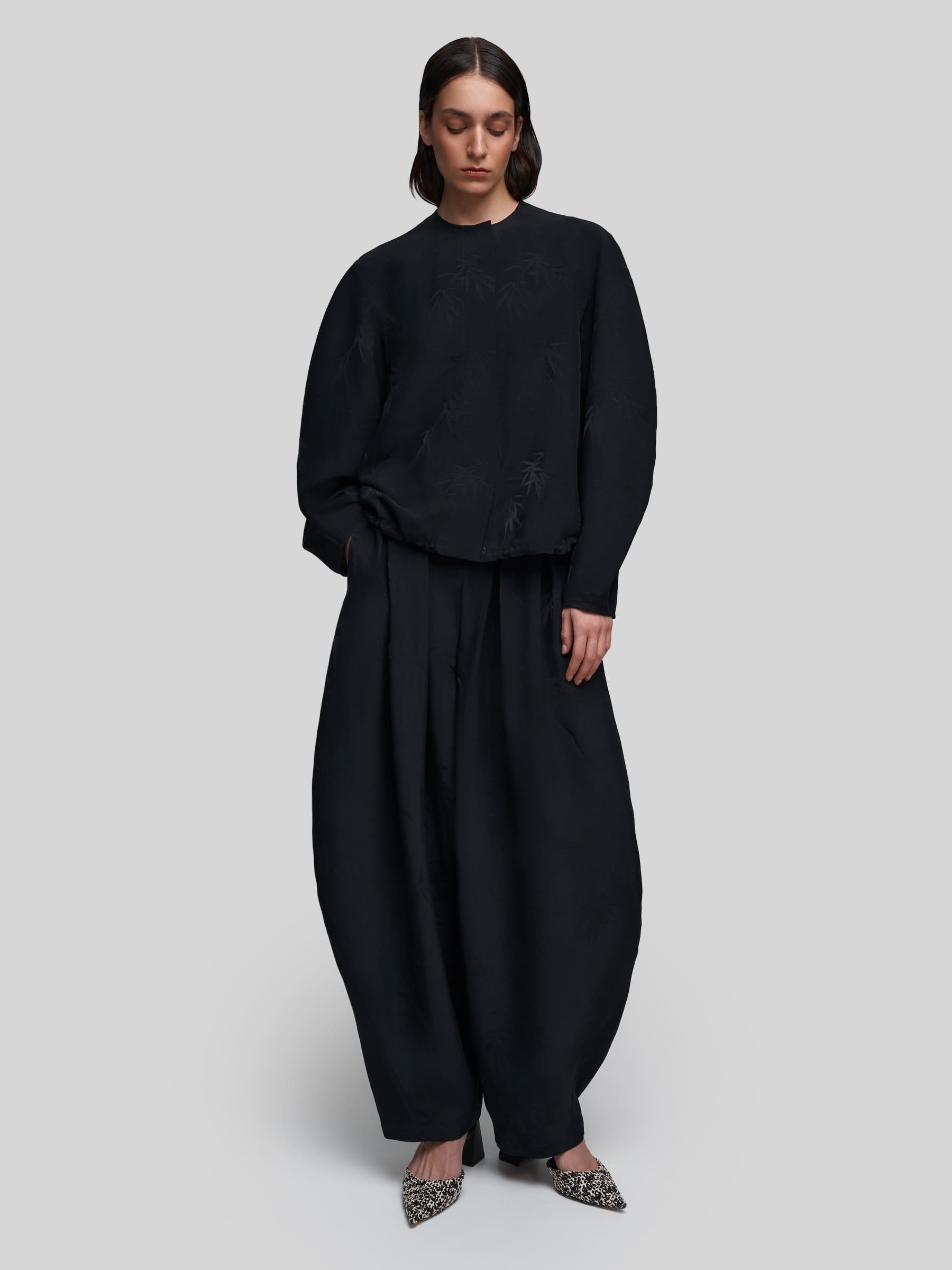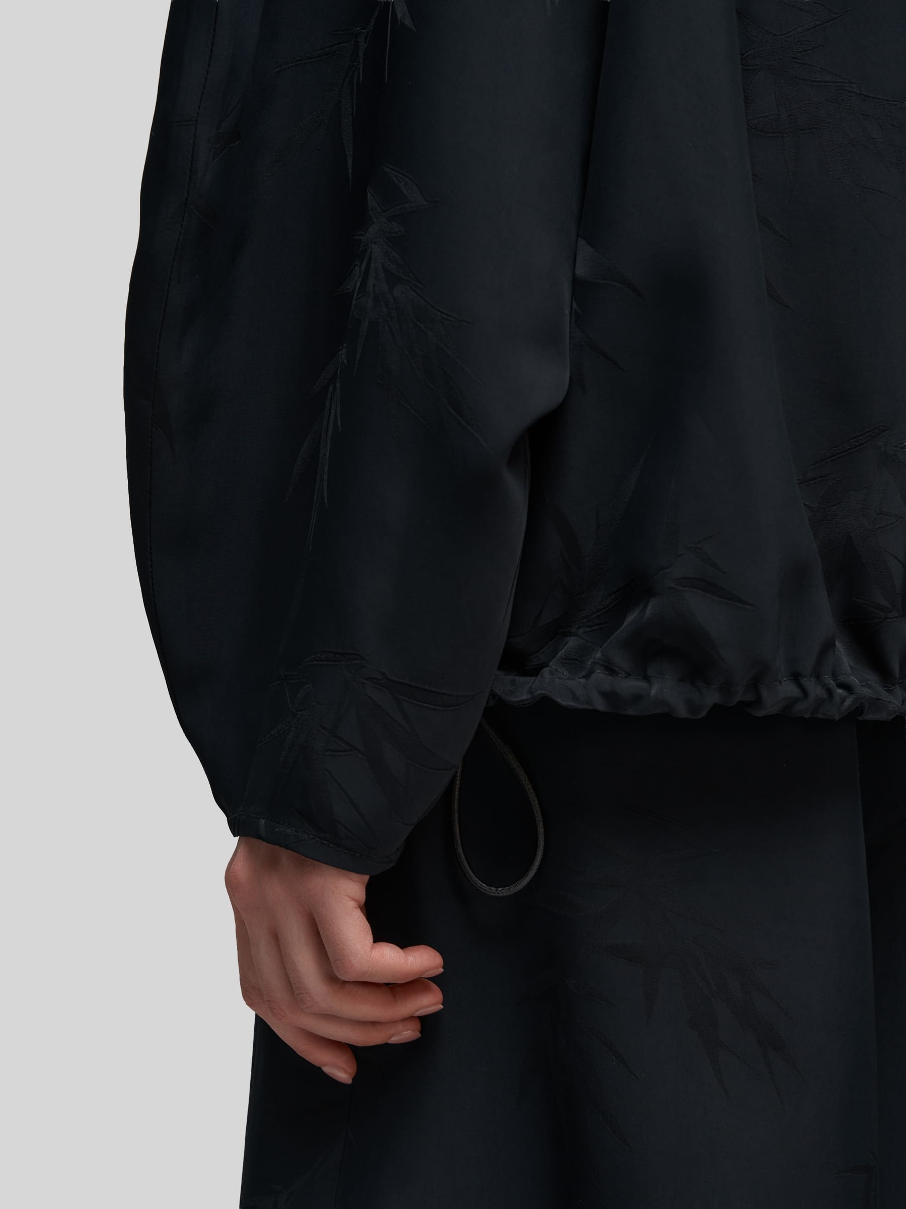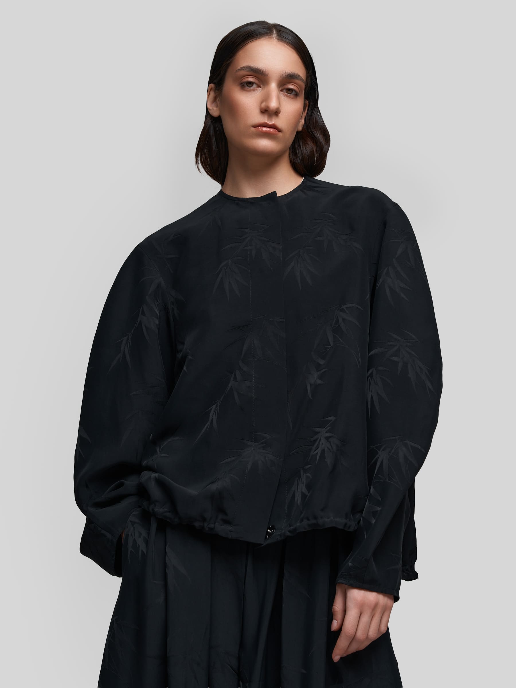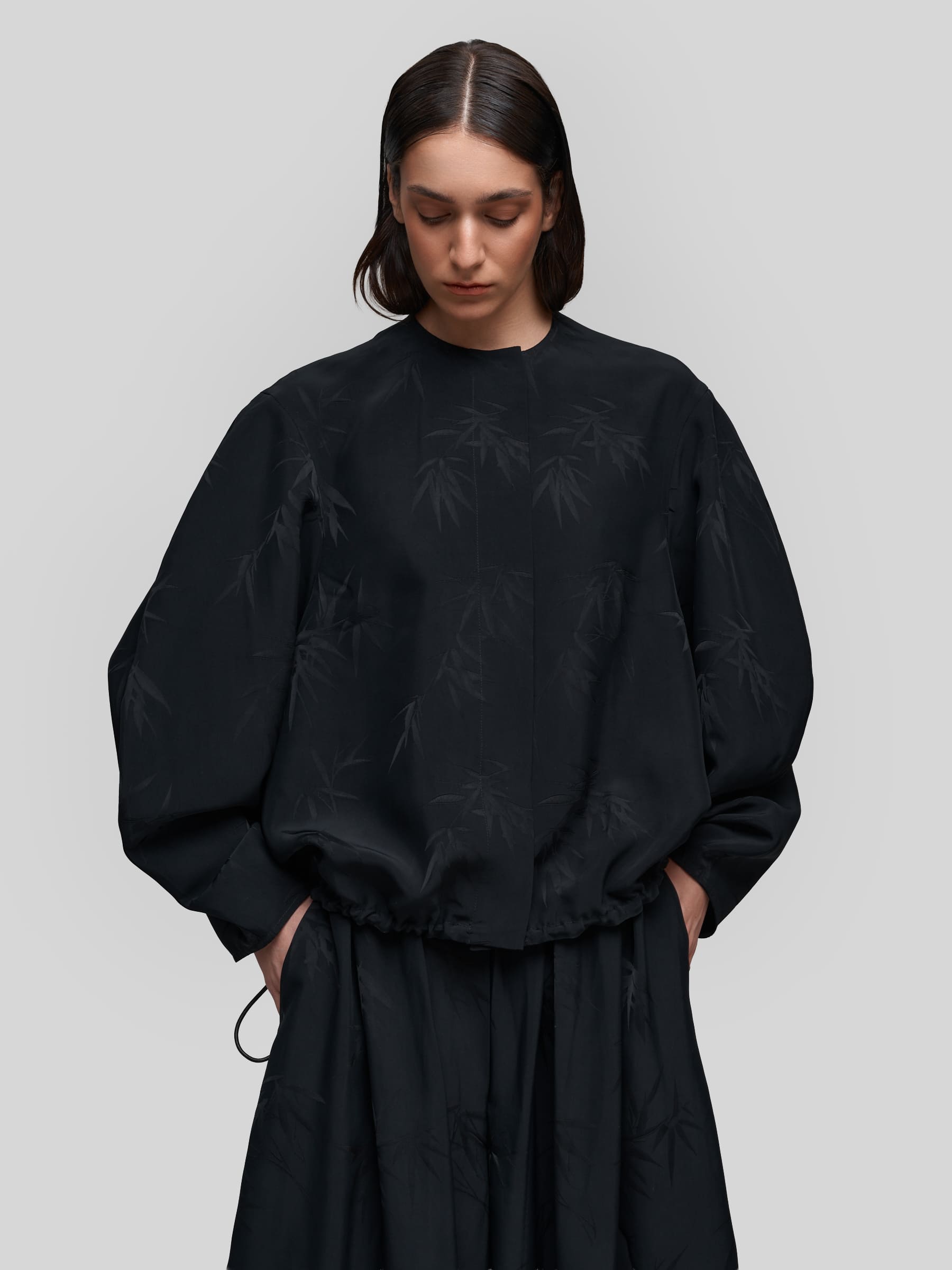 Лёгкий бомбер О-силуэта из струящейся ткани чёрного цвета с принтом «Бамбук». Модель с широкими рукавами и спущенным плечом создаёт расслабленный, но стильный силуэт. Можно носить как самостоятельную блузку или использовать для многослойных образов.