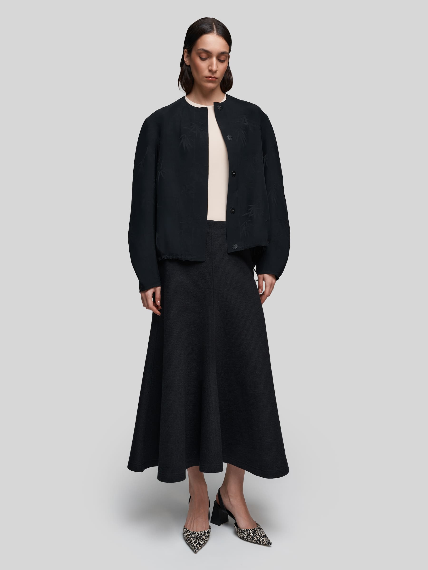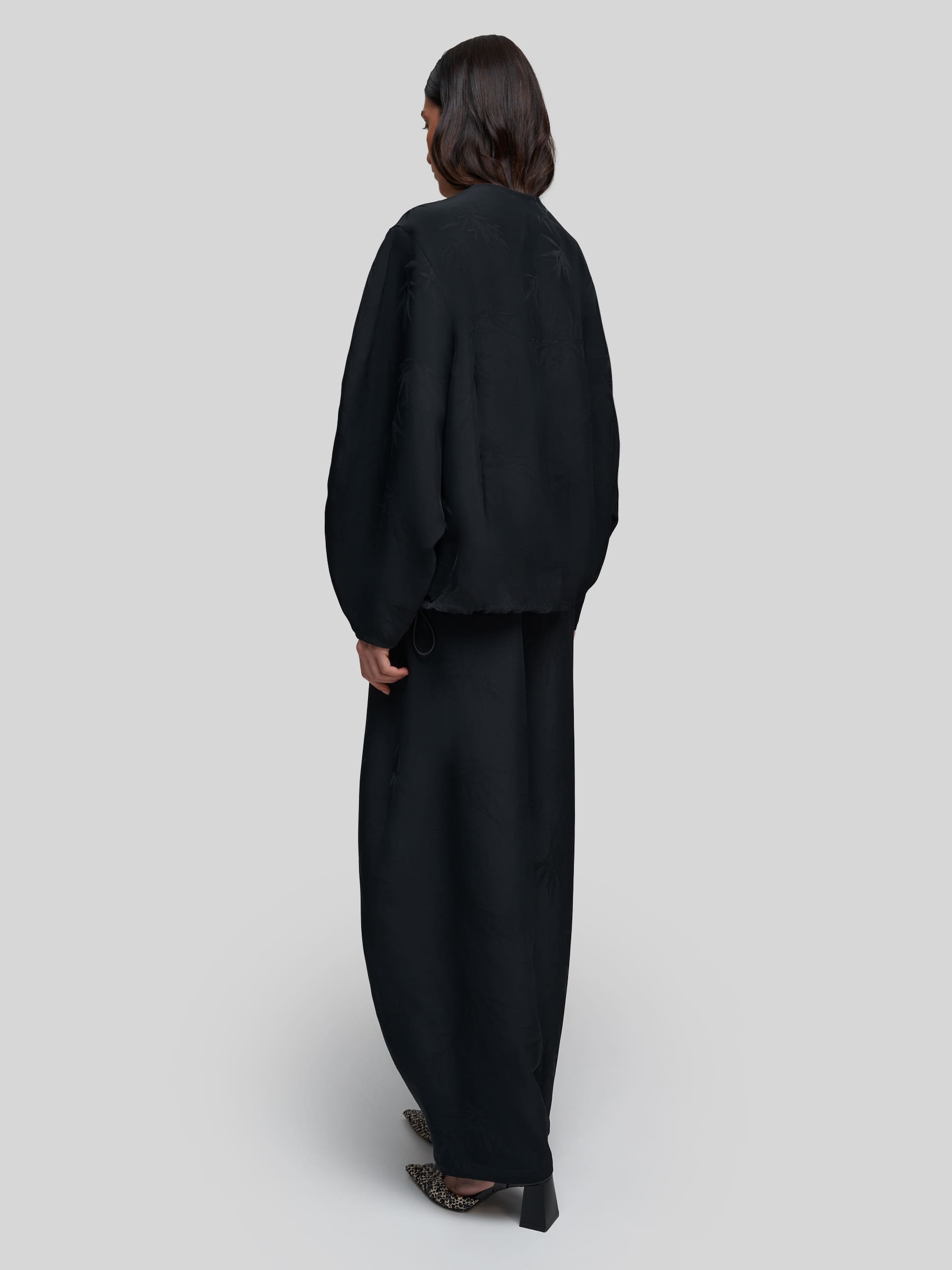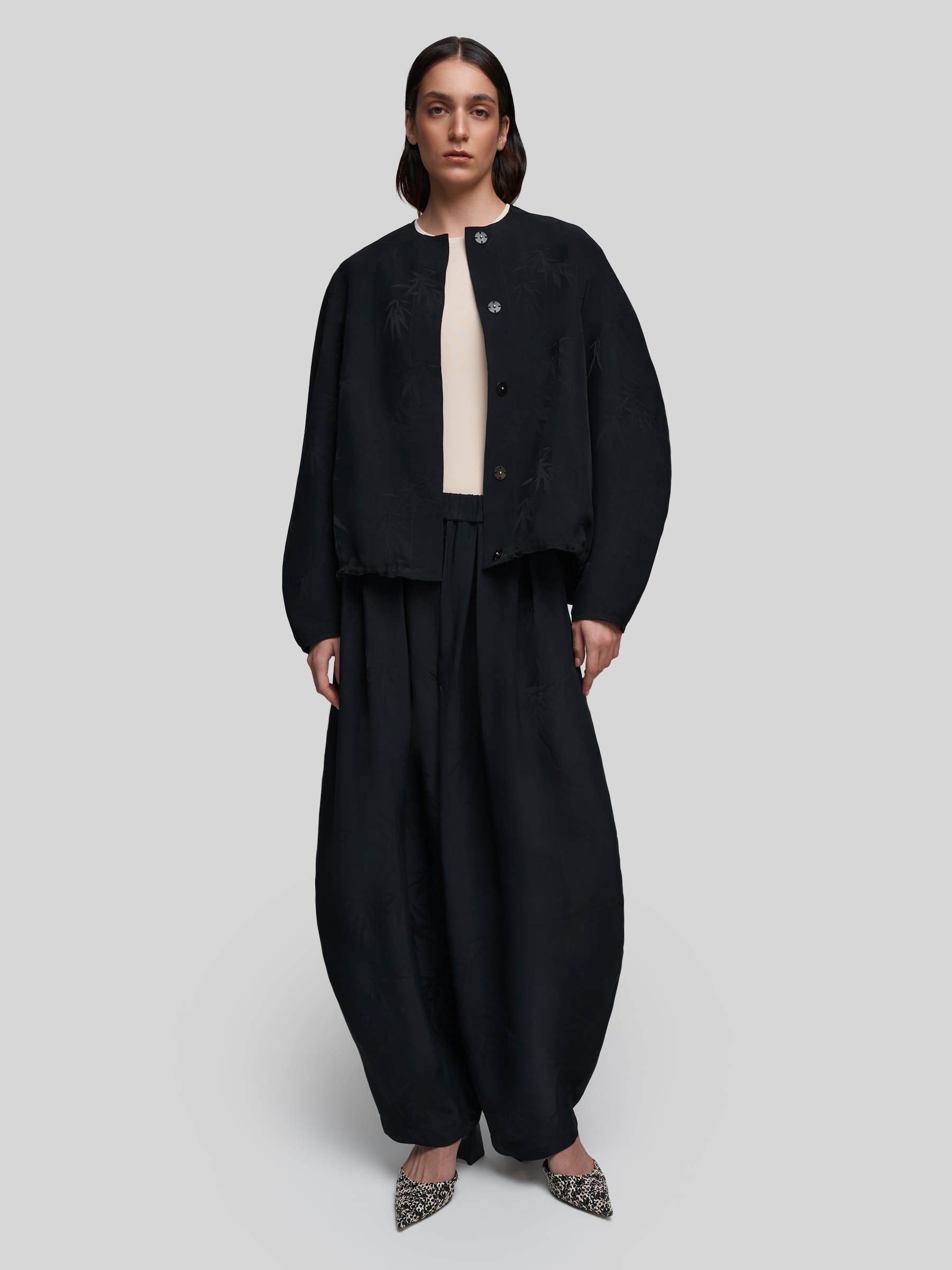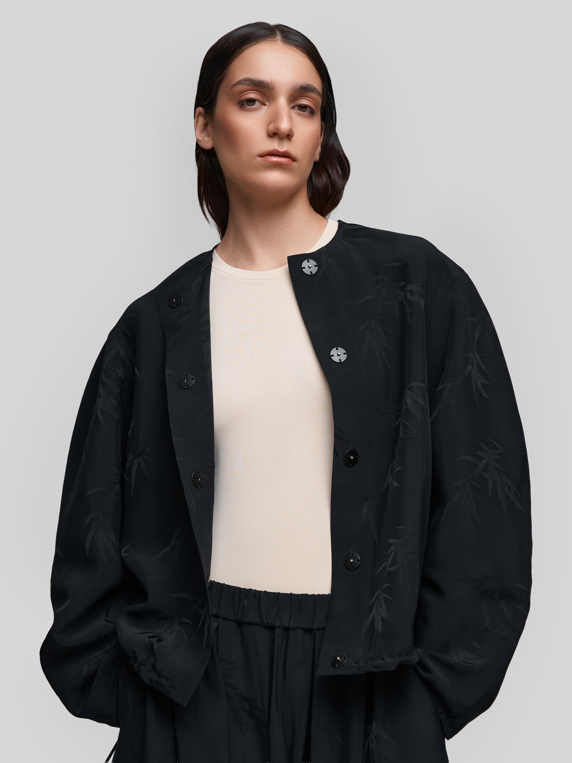 Лёгкий бомбер О-силуэта из струящейся ткани чёрного цвета с принтом «Бамбук». Модель с широкими рукавами и спущенным плечом создаёт расслабленный, но стильный силуэт. Можно носить как самостоятельную блузку или использовать для многослойных образов.